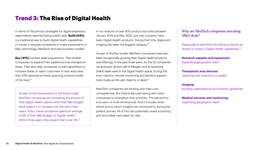 数字健康的崛起:医疗科技公司领导通过在研发、技术、数字和新商业模式方面的投资,建立内部能力,从而优先重视数字健康;通过资产收购,扩大治疗领域的渠道,增加新的能力,以更快地创新或以新的方式接触客户。几乎所有(99%)的高管都表示,数字健康解决方案的开发和商业化在过去两年加速了。