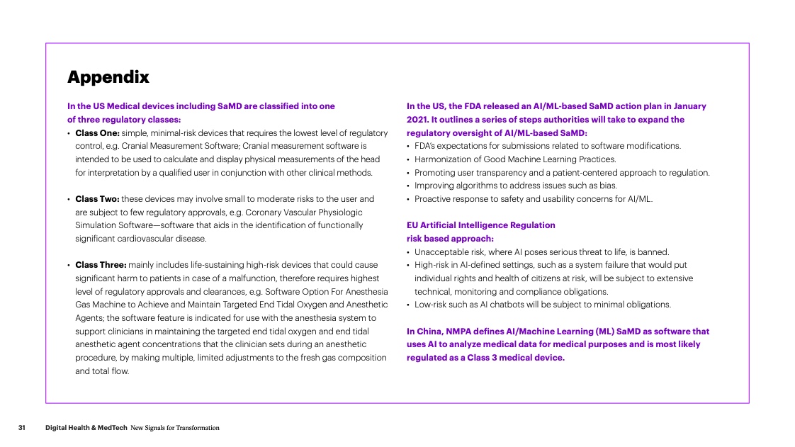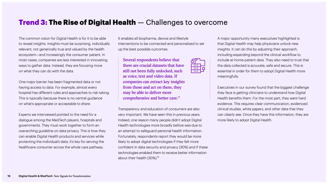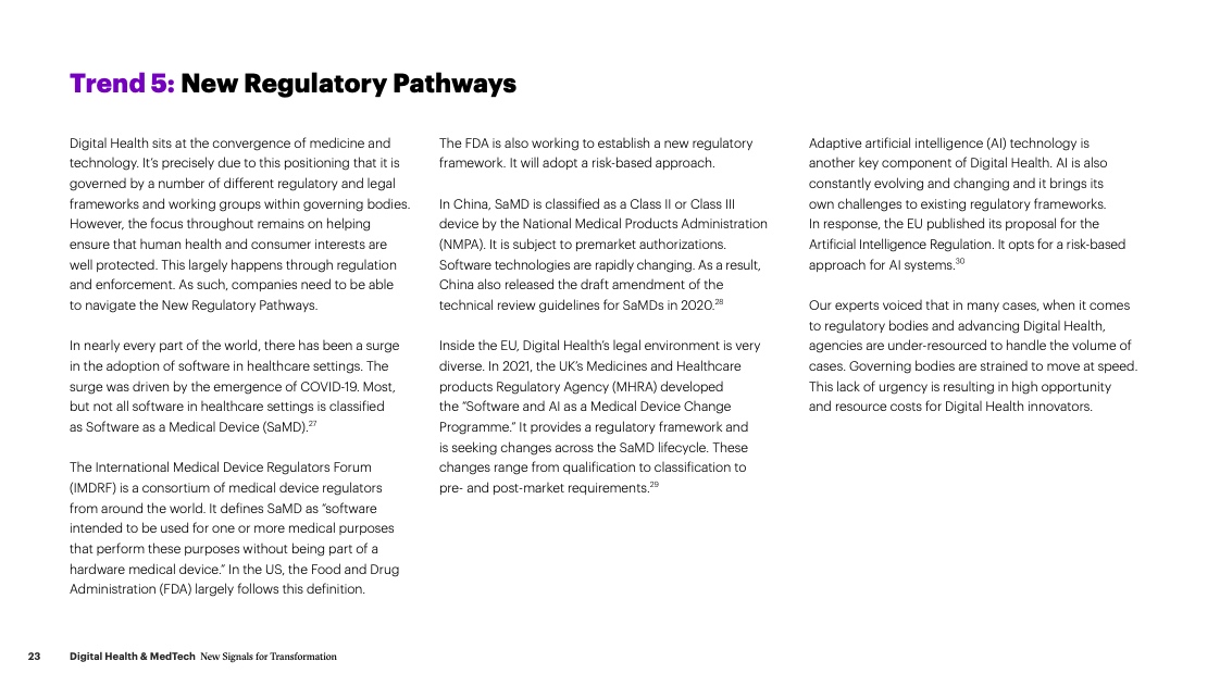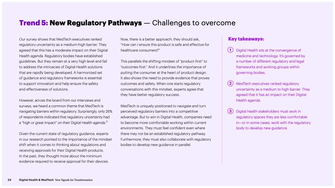 新的监管路径:数字健康可能超出未经测试的技术的既定监管路径,需要采取新的方法。大多数高管(87%)认为政府法规对他们的业务构成威胁和干扰。这可能是由于监管机构努力跟上新技术的发展速度,并确保其安全有效,监管指南的性质发生了变化。