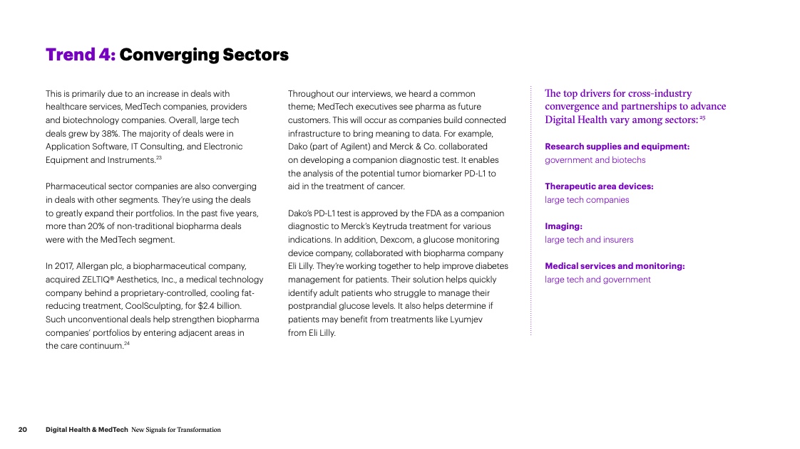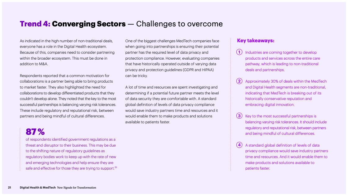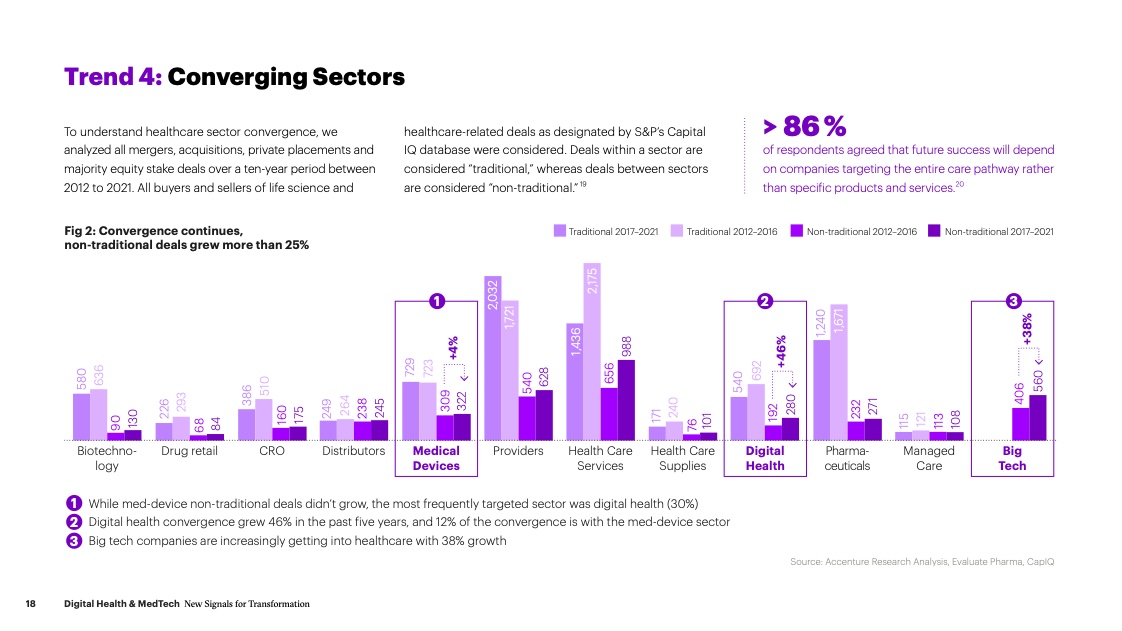 融合的行业:近9/10的高管(86%)表示,医疗保健数字化的兴起也在推动非传统交易,未来的成功取决于各个行业在整个医疗连续性中融合开发产品和服务。
