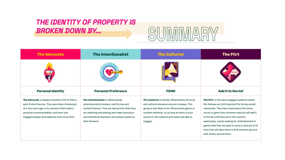 “粉丝”和“超级粉丝”这两个词一直被用来描述娱乐业的消费者,但这两个词对于今天的娱乐行业来说过于笼统——粉丝是很复杂的。Fandom首席营销官 Stephanie Fried表示:“了解各个层次的粉丝身份并在正确的时间和地点与他们建立真实的联系,将成为品牌在流媒体、影院和视频游戏发行方面实现成果最大化的关键。”