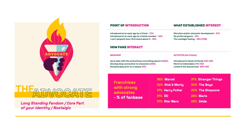● 拥有大量拥护者的流行作品有:漫威、《哈利波特》、《怪奇物语》、《瑞克与莫蒂》、DC、《塞尔达》、《星球大战》、《马里奥》、《黑袍纠察队》、《辛普森一家》执念者(个人偏好),平均占粉丝人数的31%