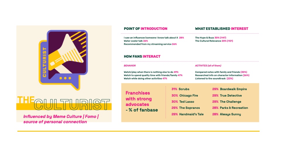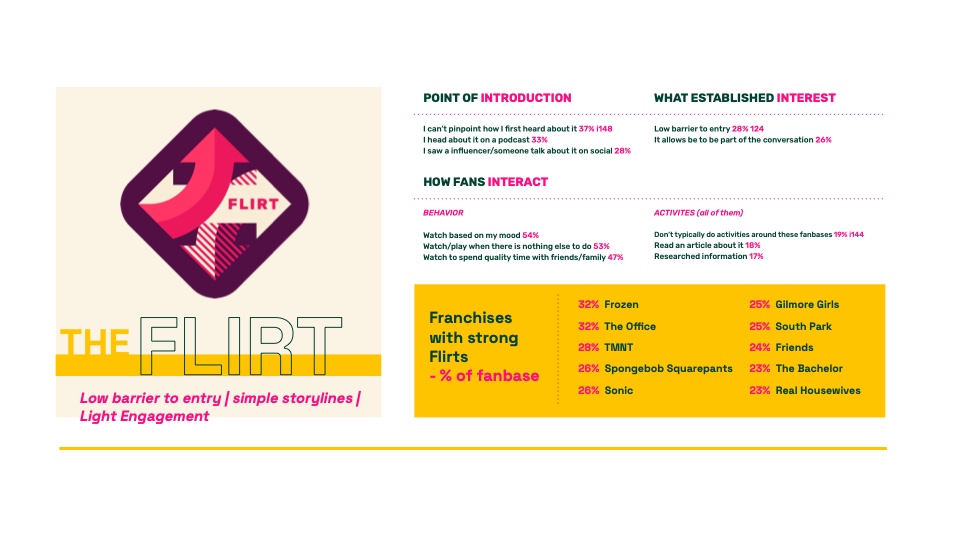 ● 这类粉丝很容易受到某一作品所引发的社会热潮和文化的影响,包括流行梗和意见领袖;他们会“害怕错过正在社交媒体上发生的事”(FOMO)并参与闲聊;会一边做其他事情,一边观看或游玩;还会通过他们的粉丝圈与家人和朋友互动。