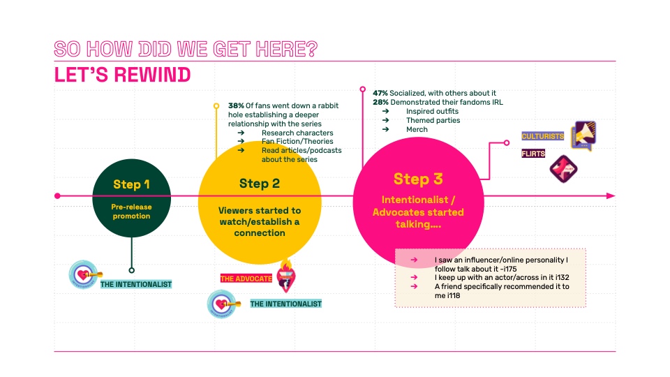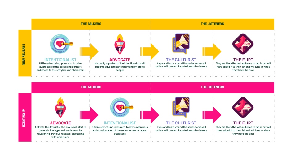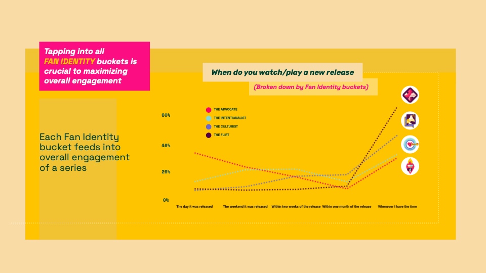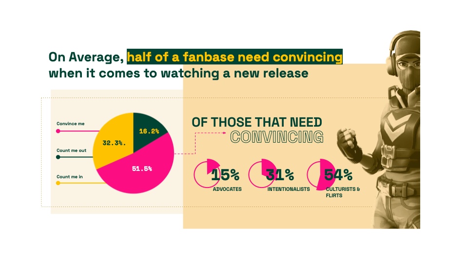 ● 54%对观看/尝试新作品持观望态度的消费者是跟风者和交友者,因此可以通过在整个发行窗口对他们进行营销来吸引他们的注意力。