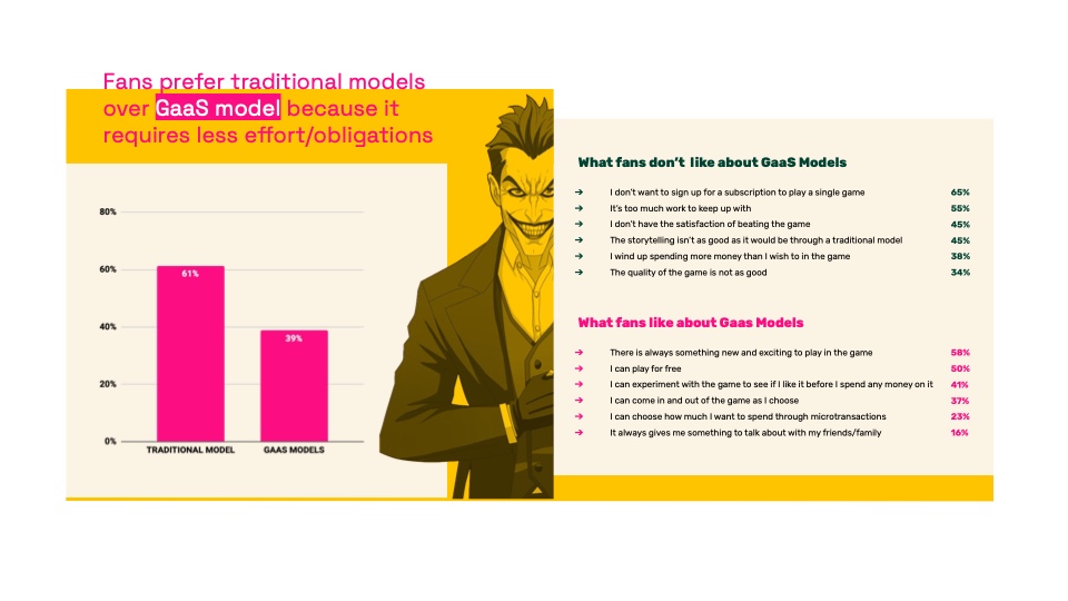● 尽管行业偏向于服务型游戏(GaaS)模式,但60%的消费者喜欢传统的游戏发行模式。