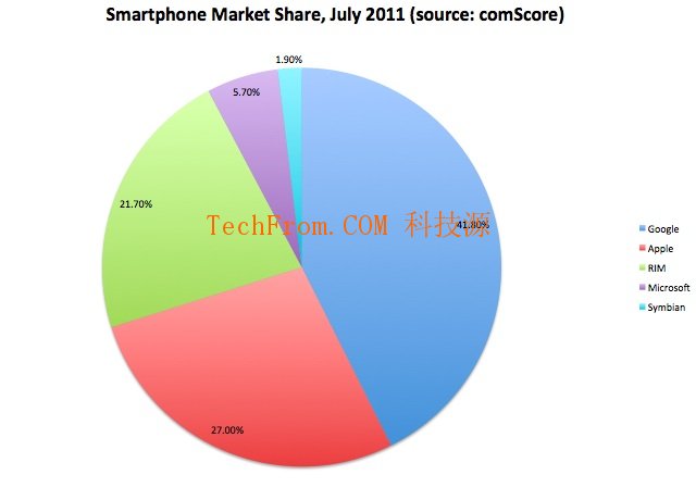 Google 的 Android 占据了 41%的市场;苹果 Apple 占据 27%;黑莓 RIM 占据 21.7%;