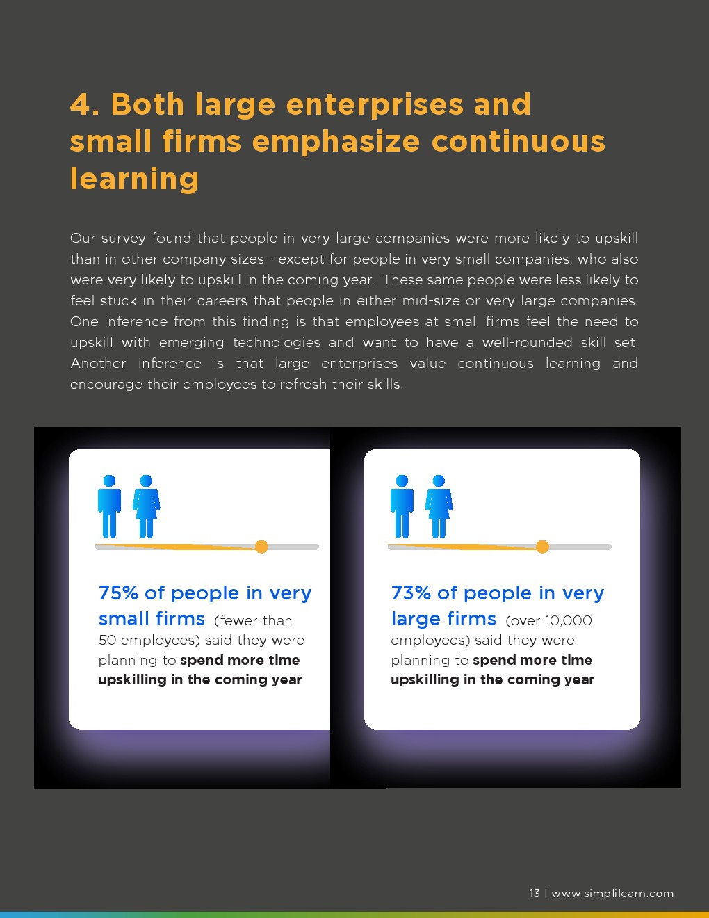 调查发现,与其他规模的公司相比,大型公司的员工更有可能提高技能,但小型公司的员工除外在未来一年也很可能提高技能。与中型或非常大的公司相比,这些人不太可能感到自己的职业生涯陷入困境。这一发现的一个推论是,小公司的员工觉得有必要提高新兴技术的技能,并希望拥有全面的技能。另一个推论是,大型企业重视持续学习,并鼓励员工更新技能。
