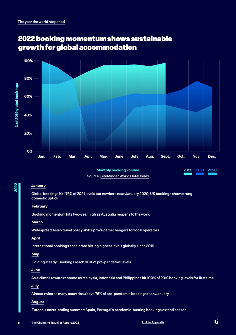 SiteMinder今年1-8月份的酒店预订数据显示,4月份全球预订量创新高,超过2019年同期水平,5月份的预订量保持在疫情之前90%的水平。