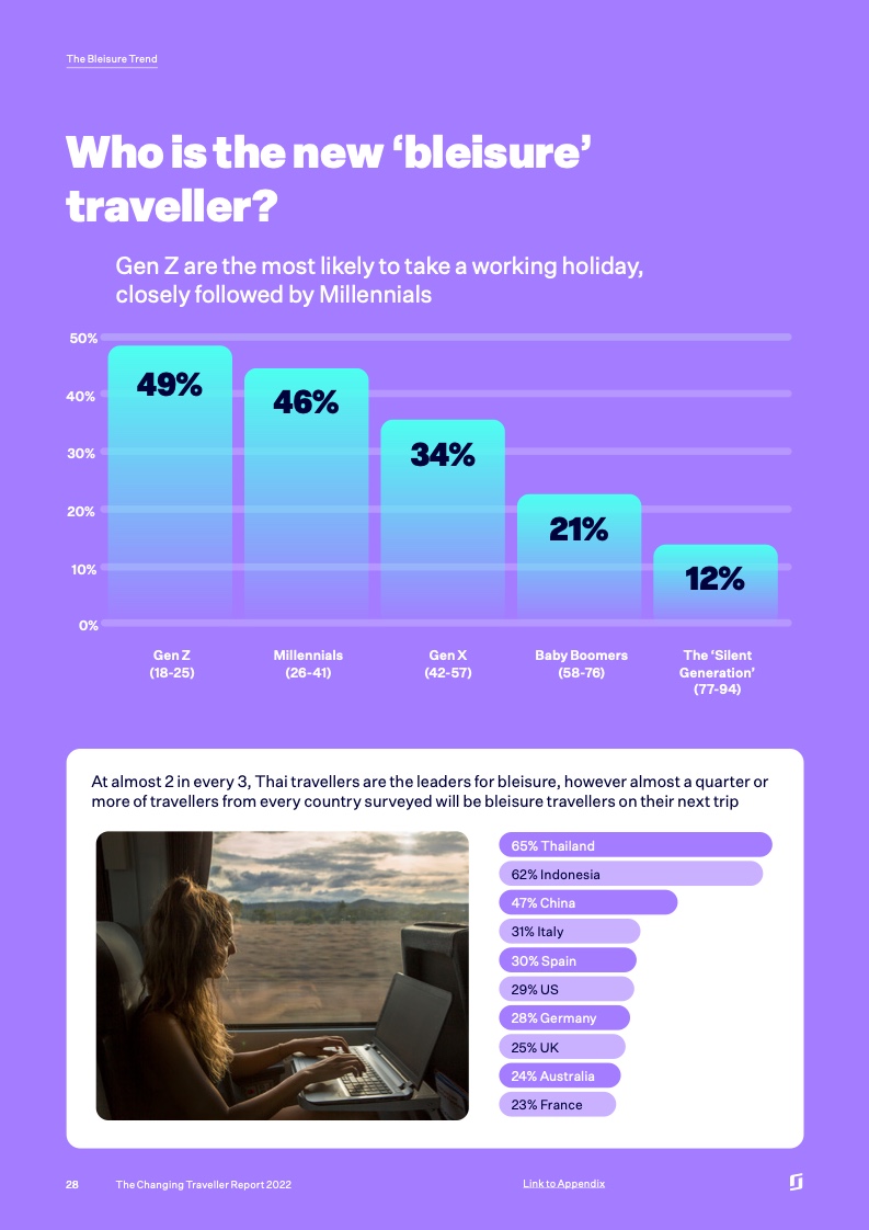 从年龄分布来看,Z世代的bleisure旅客最多,占比达49%,其次是千禧一代(46%)和X世代(34%)。