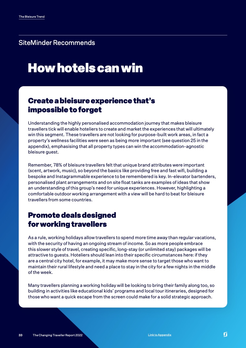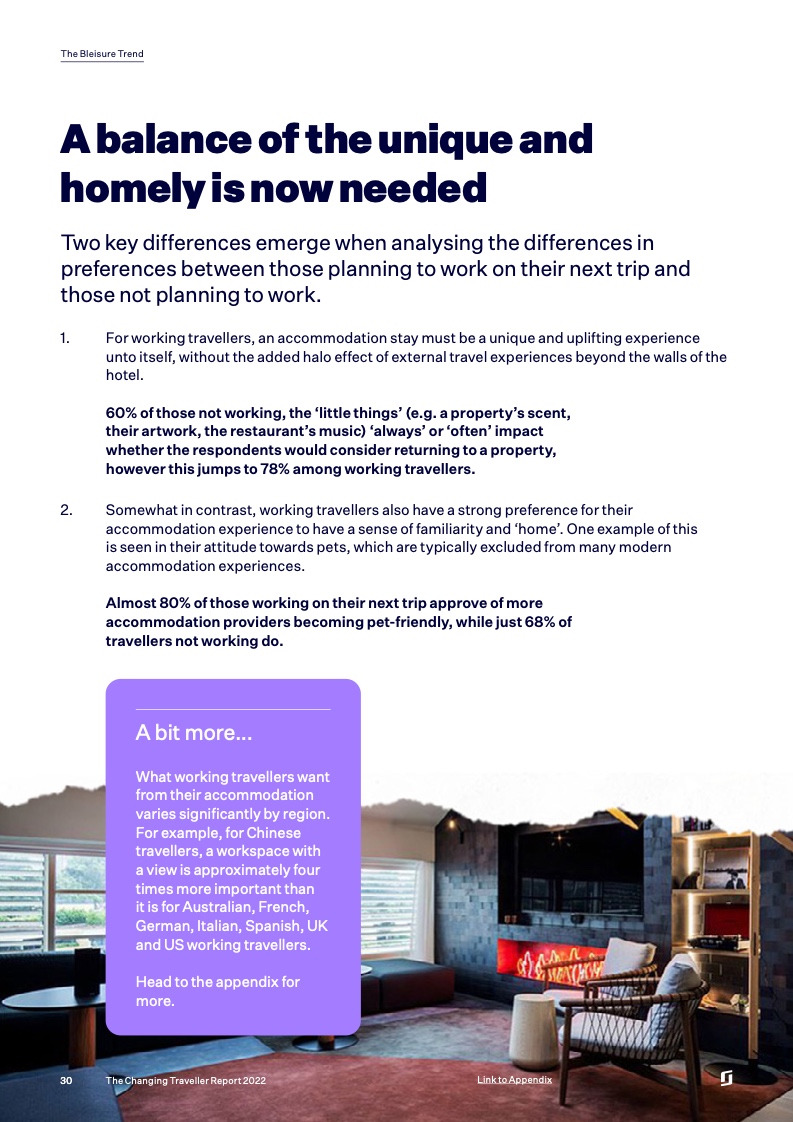 60%的休闲旅客表示,房源里面的气味、艺术装置以及餐厅的音乐等细微元素通常会他们下次是否会再次入住,而受这些因素影响的bleisure旅客占比则达到78%。