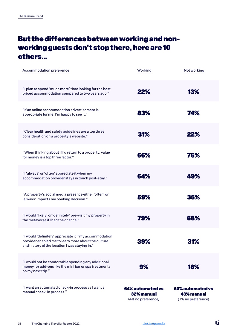 与此同时,91%的bleisure旅客(休闲+差旅)更愿意在住宿上花更多钱,比休闲旅客的占比高出9个百分点。