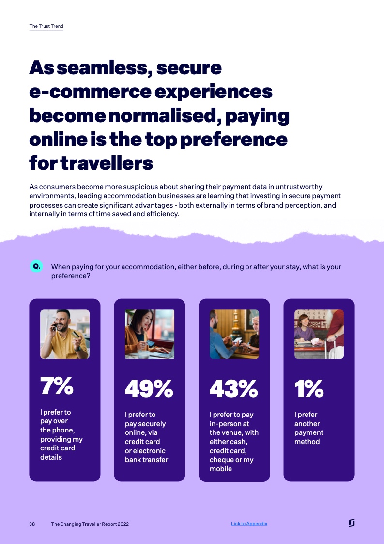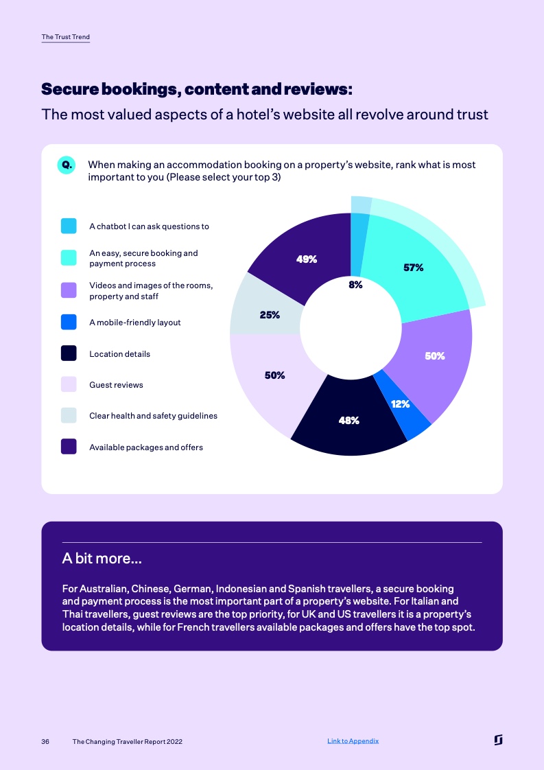 超过半数(57%)的受访旅客认为简单安全的预订和支付流程最重要,50%的旅客认为要有客房、建筑和员工的相关视频和照片,48%的旅客则更关注地址信息。