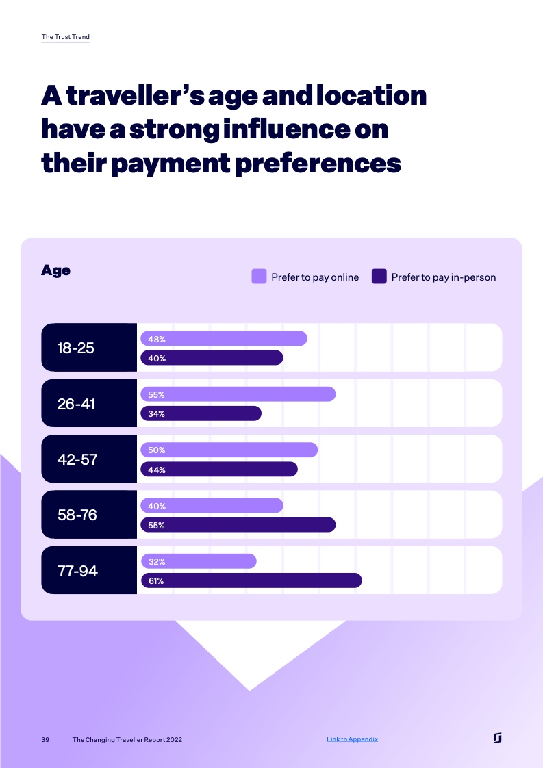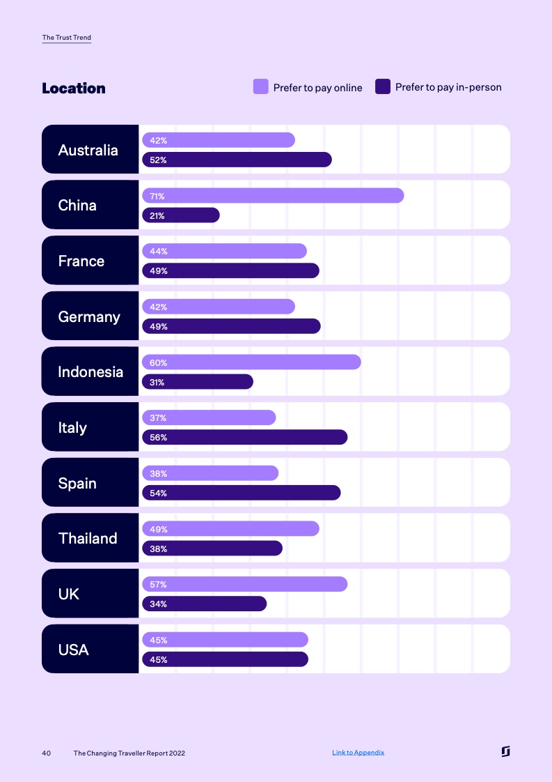 意大利(56%)、西班牙(54%)、澳大利亚(52%)、法国(49%)和德国(49%)等国选择线下支付的旅客占比更高。