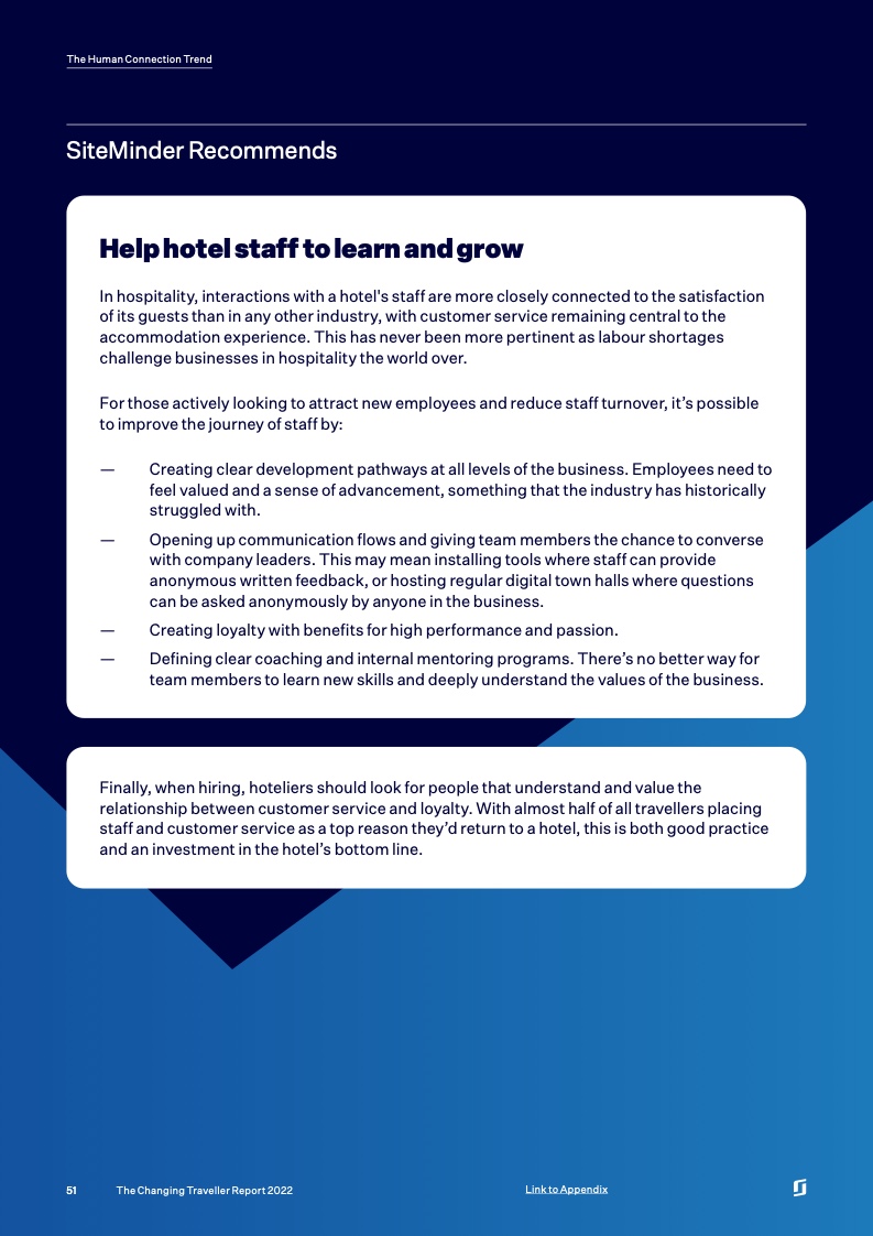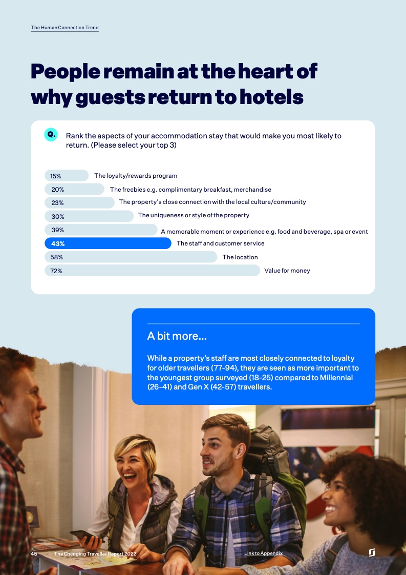 除了货币汇率和酒店位置等外在条件,吸引旅客再次入住的最重要因素是员工和顾客服务(43%),其次是难忘的体验(39%)和酒店风格的独特性(30%)。