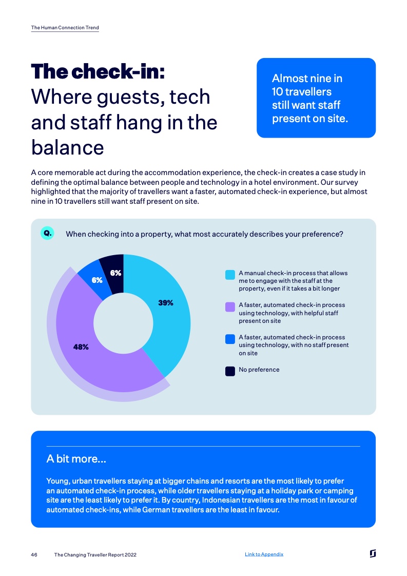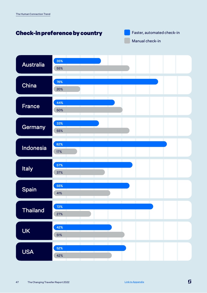 不过,印度尼西亚(82%)、中国(76%)、泰国(72%)、意大利(57%)、西班牙(55%)和美国(52%)的旅客还是更倾向于自助入住。