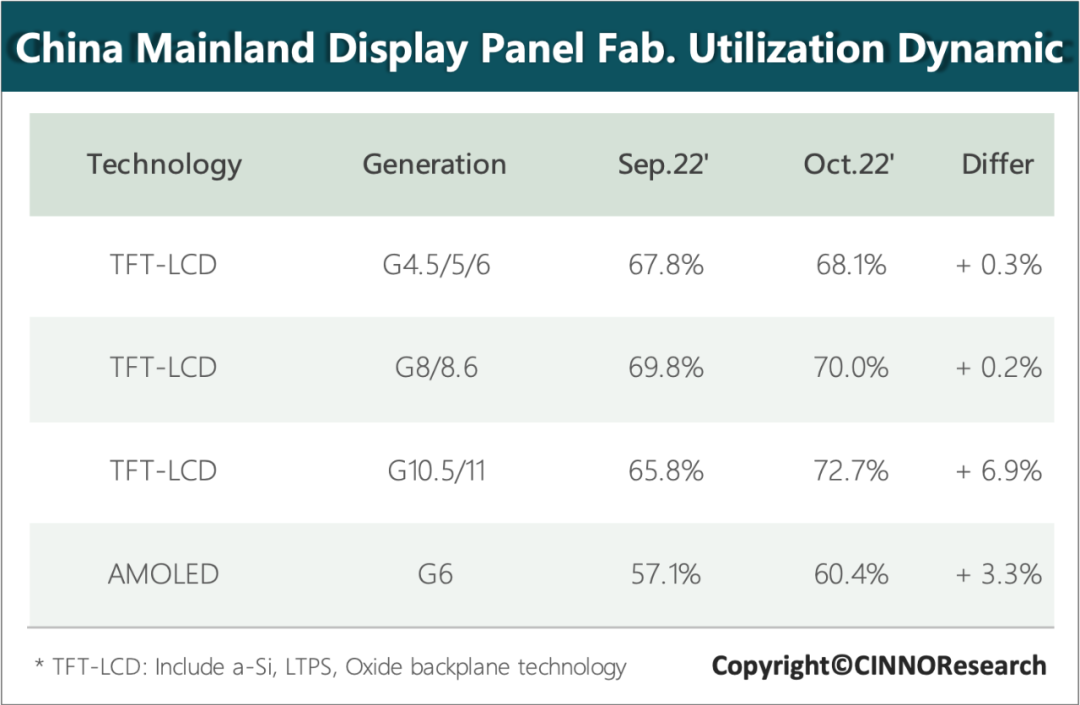 CINNO Research 表示,以全球面板厂投产数据来看,10 月整体稼动率回弹至 65% 左右,11 月预计将再有 5 个百分点左右的提升,但 12 月又会有一定幅度的回落。预计整个第四季度全球 TFT-LCD 面板产线稼动率控制在 70% 以下。