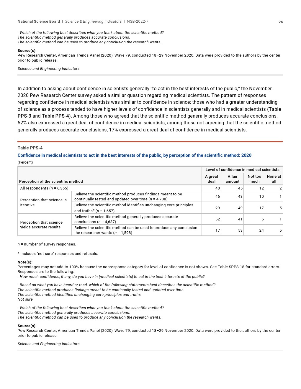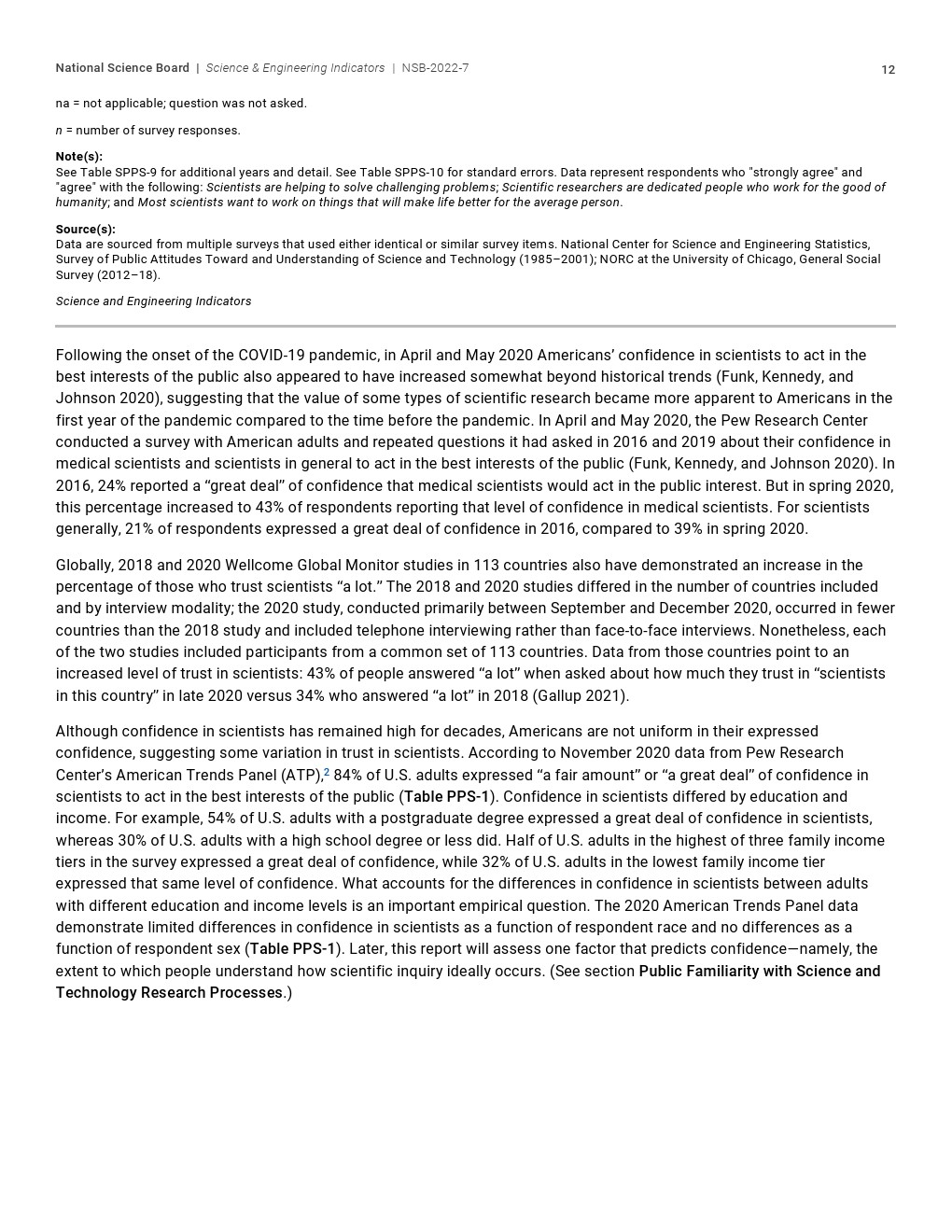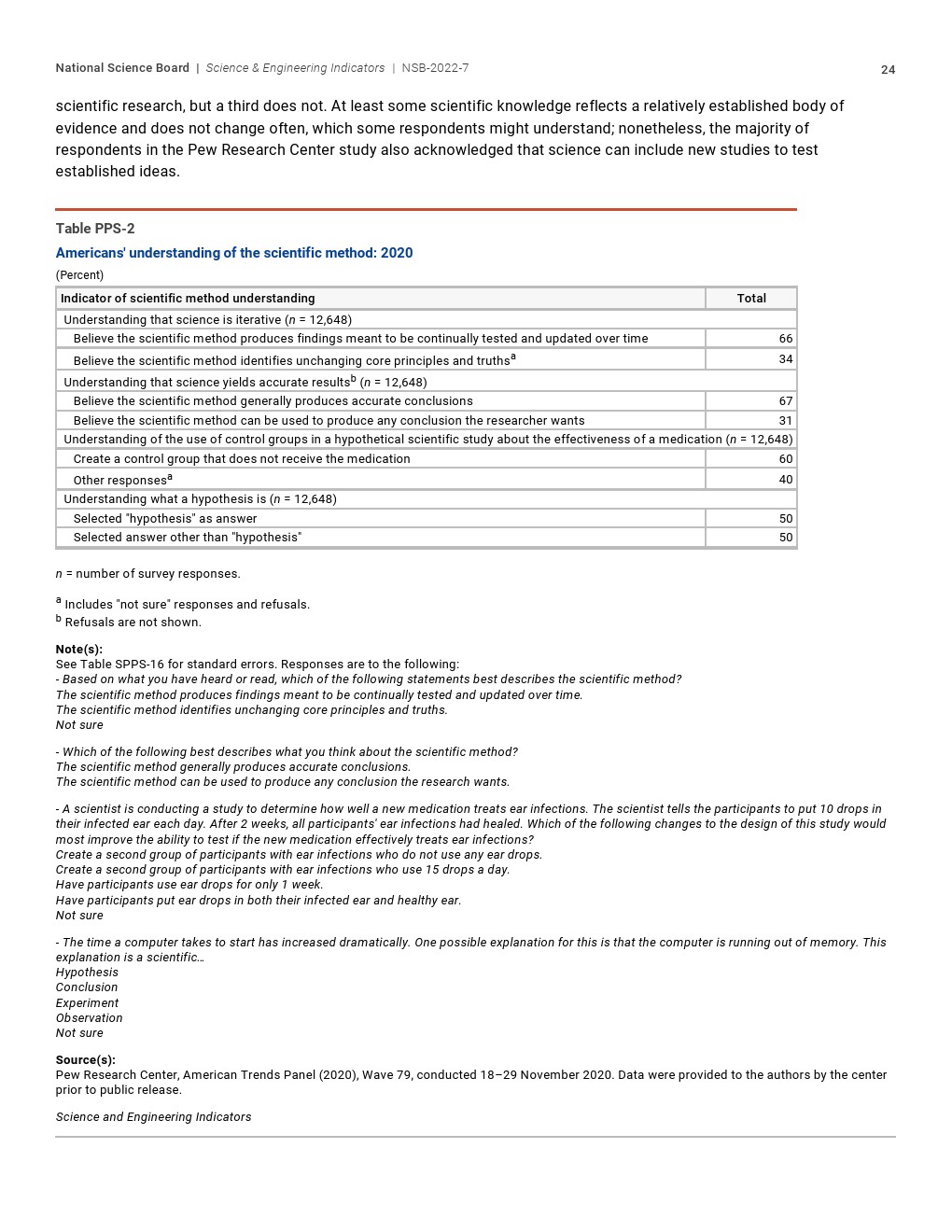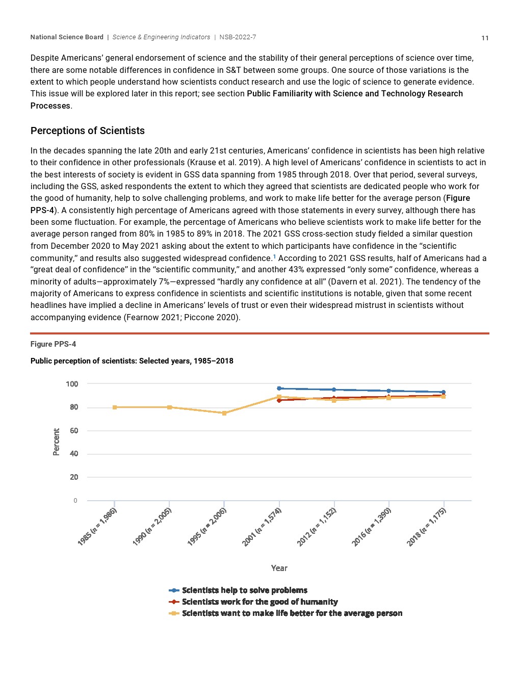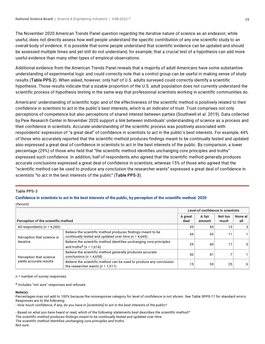 大多数美国成年人表示对科学研究原理有基本的了解,例如研究对照组与治疗组比较的有用性。与此同时,那些表现出对科学逻辑有更多理解的人往往比那些表现出较少理解的人更相信科学家会为社会的最大利益而采取行动。