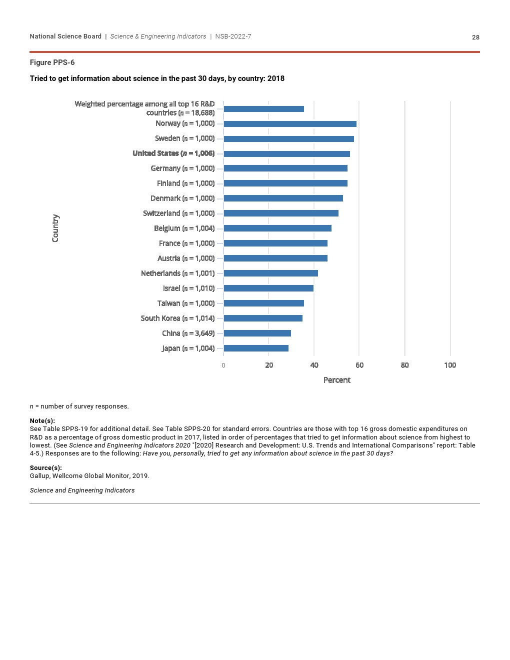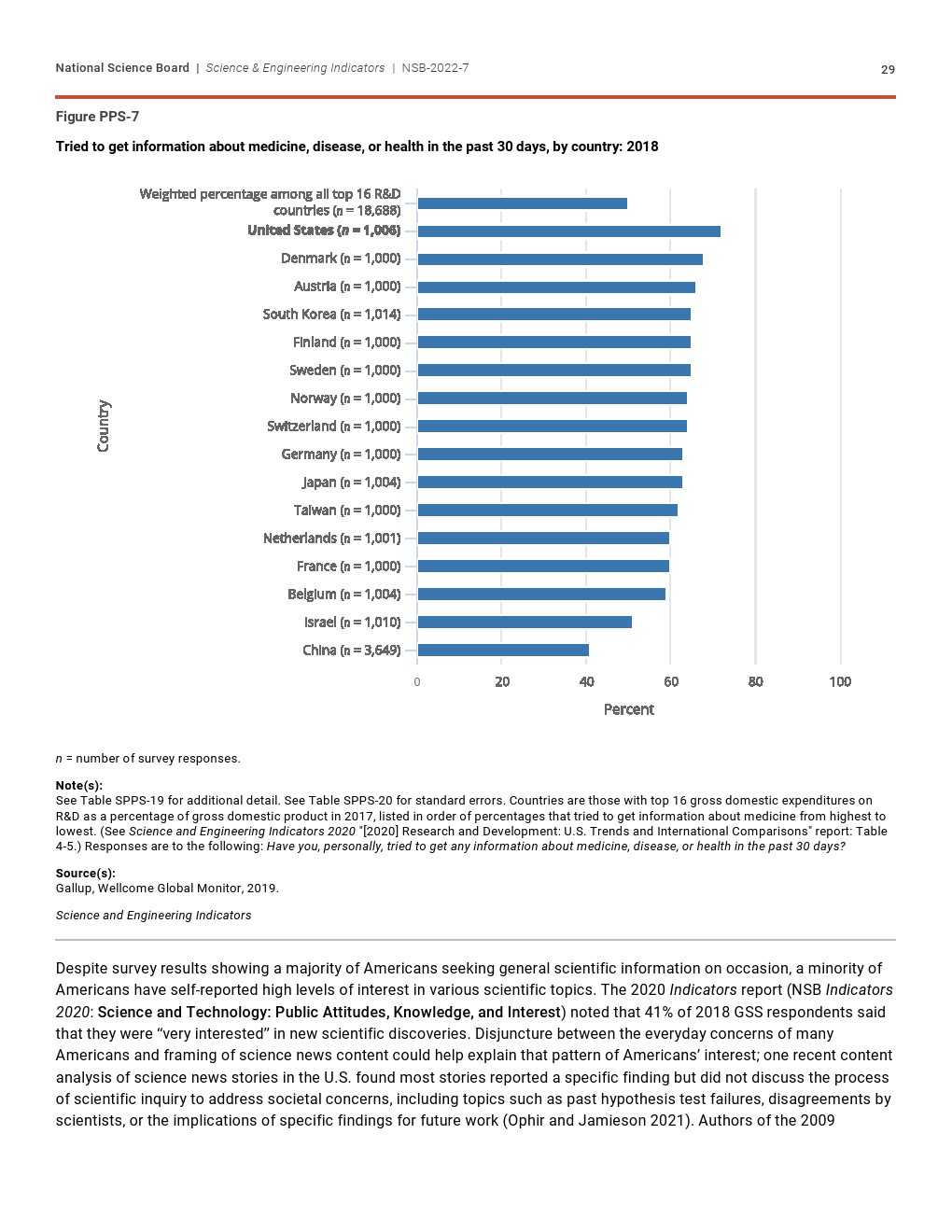 美国成年人比大多数其他研发支出水平相似的国家的成年人更愿意寻求科学信息。2018年,大多数美国成年人最近在寻找有关医学或疾病的信息。