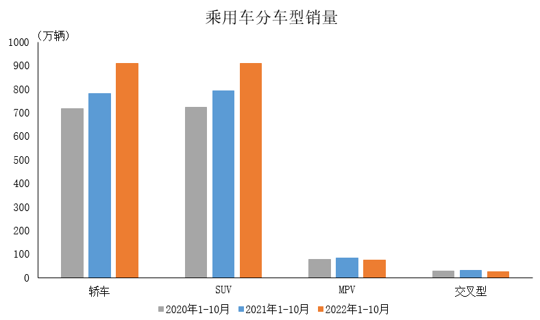 2022 年 1-10 月,在乘用车主要品种中,与上年同期相比,基本型乘用车(轿车)和运动型多用途乘用车(SUV)保持较快增长,其他两大类车型呈现不同程度下降。