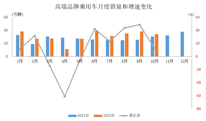 2022 年 10 月,国内生产的高端品牌乘用车销量完成 34 万辆,同比增长 12.5%。