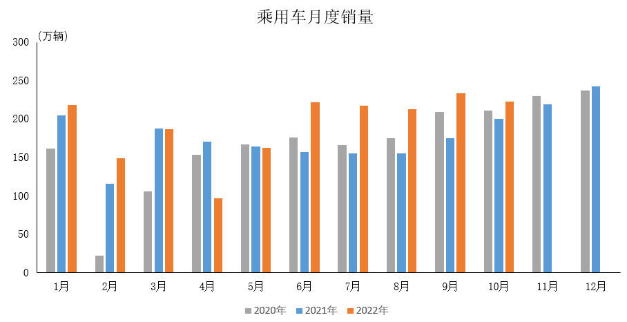 2022 年 10 月,乘用车共销售 223.1 万辆,环比下降 4.3%,同比增长 10.7%。