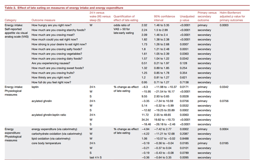 在16小时清醒期间,较晚进食组瘦素平均值降低了16% (p<0.0001),胃饥饿素/瘦素比提高了34% (p<0.0001),而在8小时睡眠期间,较晚进食组瘦素平均值增加了10% (p=0.0028),胃饥饿素减少了13%(p=0.0002),使胃饥饿素/瘦素比降低了18% (p<0.0001)。