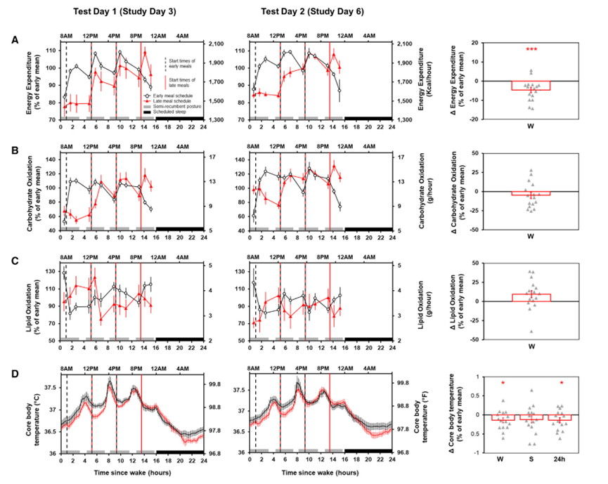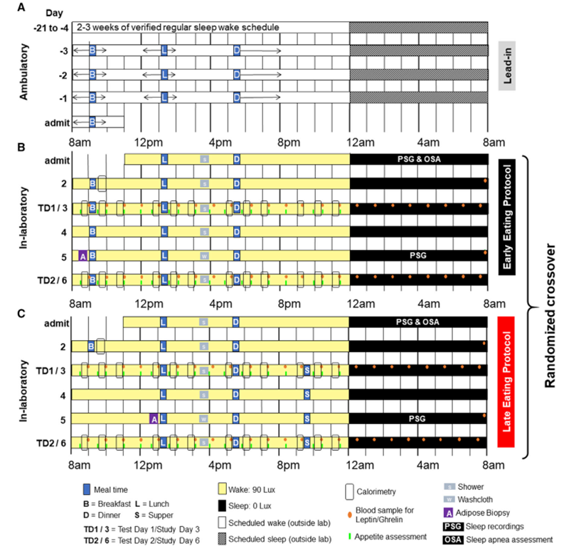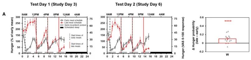 研究共纳入了16个超重或肥胖的参与者,平均年龄为37.3岁,平均BMI为28.7,其中5名参与者为女性。在试验开始前的2-3周,所有参与者保持的固定睡眠、觉醒周期,并在试验开始前的3天内定时接受研究人员计算后预先准备的饮食。接着,参与者被随机分配为两组,分别根据较早进食方案和延迟250分钟的较晚进食方案用餐。