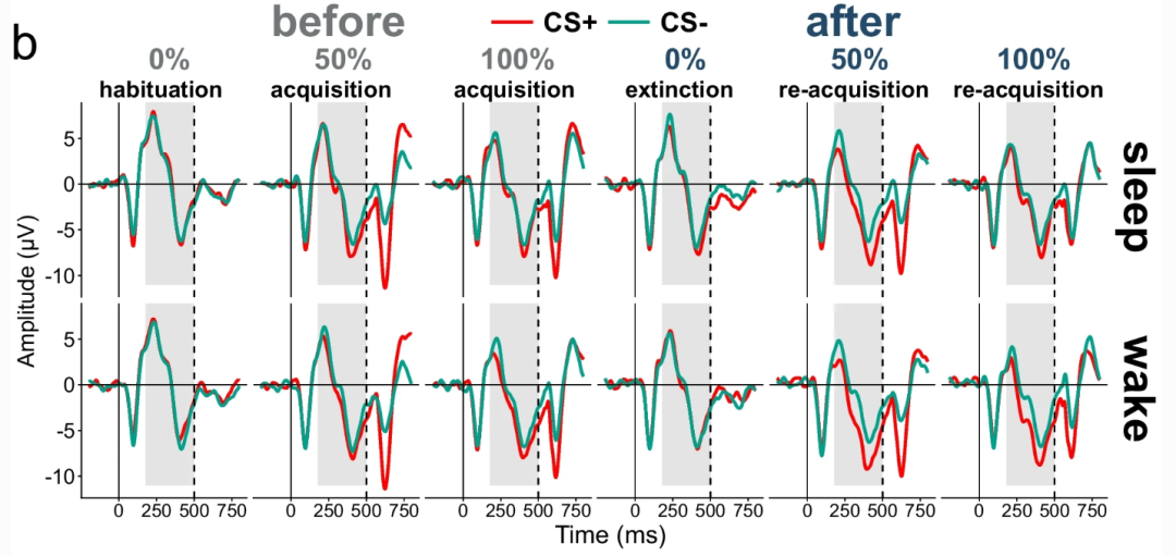 通过观察可以发现,受试者的ERP在受到厌恶性刺激之后出现明显变化,如果只接受中性刺激,则ERP保持在一个较为平稳的状态;同一时期,受试者CS+与CS-的ERP有明显差异,而且在睡眠或清醒间隔后,CS+与CS-的差异均变大。同时,也没有观察到睡眠对消退学习产生影响。