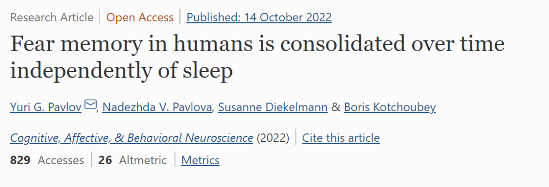 图宾根大学医学心理学和行为神经生物学研究所的Yuri G. Pavlov博士和他的研究团队使健康受试者接受条件恐惧记忆,对比了受试者进行2小时午睡或相应清醒时间后,再次接触恐惧条件的反应,发现睡眠并没有使受试者的恐惧反应行为增强,也没有影响大脑事件相关电位(ERP);恐惧记忆随着时间推移被逐渐巩固,与是否午睡无关。