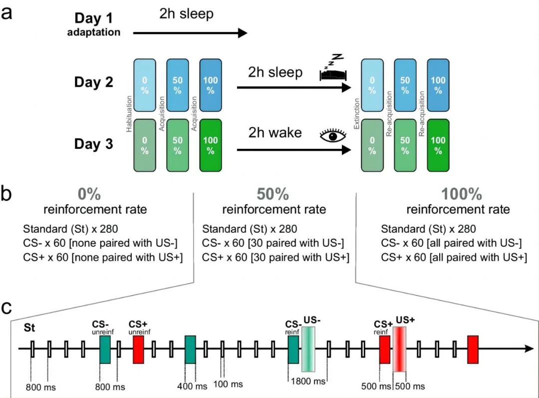受试者通过反复接收中性刺激和厌恶性刺激构建恐惧条件反射,之后进行2小时的午睡或相应的清醒时间,再进行消退学习(只接收中性刺激,不接收厌恶性刺激)、或重新获取(中性刺激和厌恶性刺激50%或100%配对)。通过主观评价和神经关联评价(即事件神经电位,ERP)对恐惧反应进行评价。