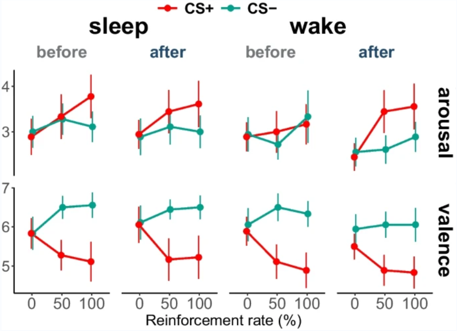 受试者对恐惧记忆的主观评价也没有受到睡眠或清醒状态的影响。但是探索性相关分析显示,在重新获取阶段,CS+受试者的负向评价与睡眠质量较高有关。