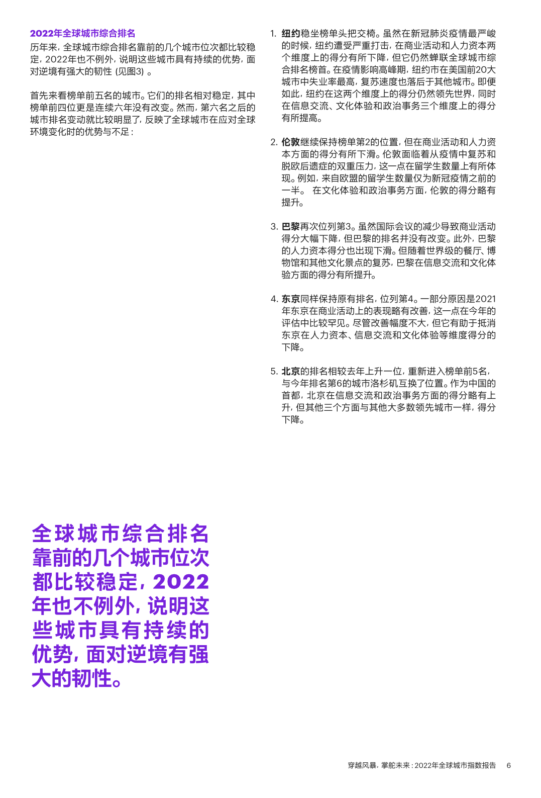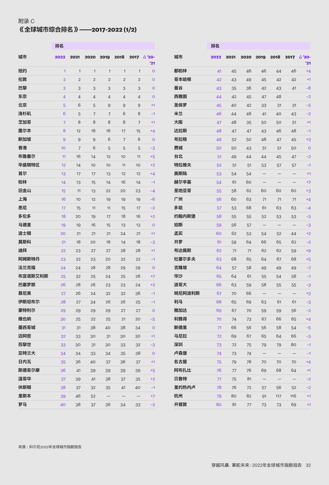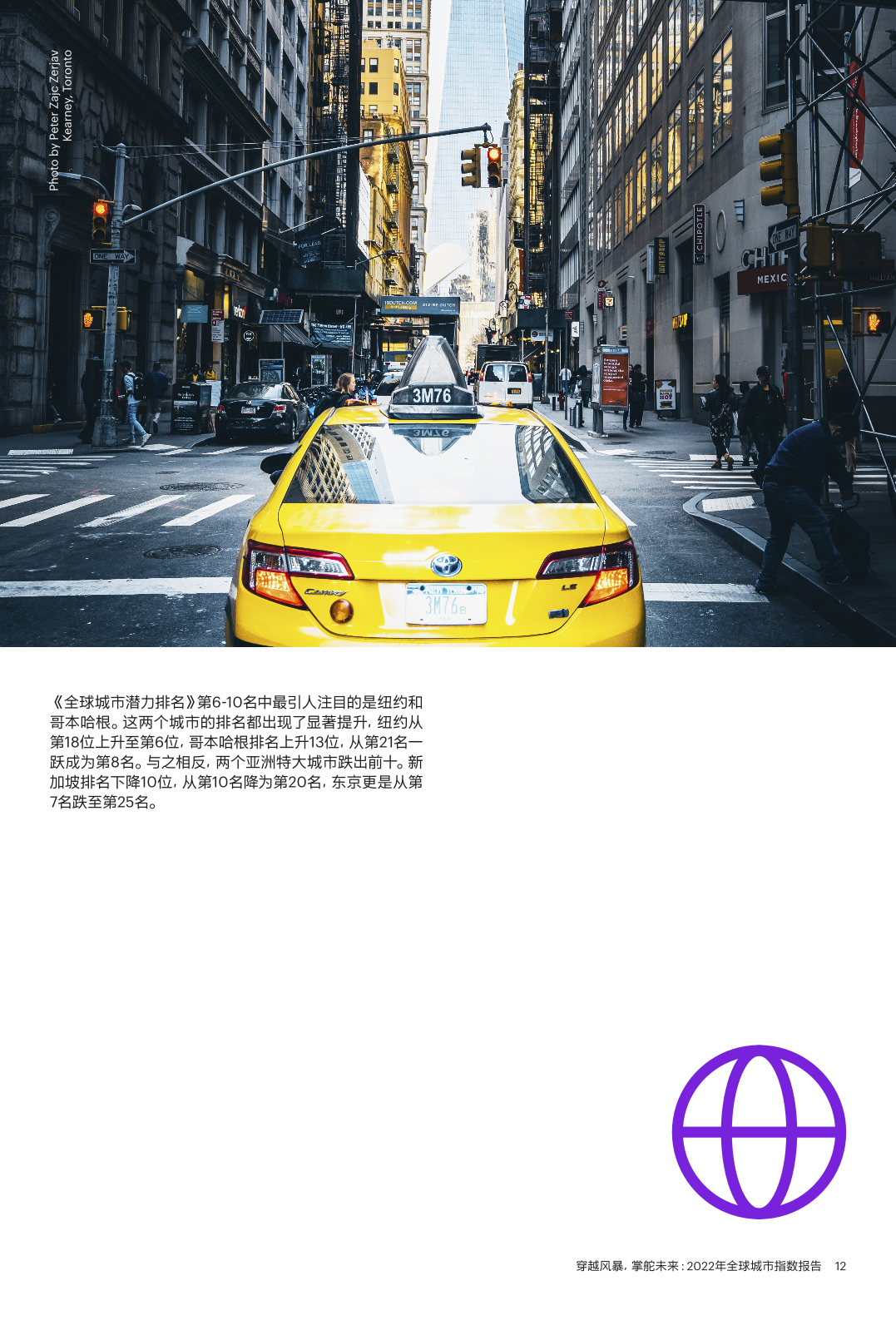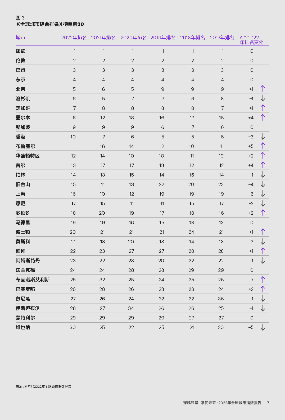 全球城市综合排名旨在量化一个城市吸引、留住和促进全球资本、人才和创意流动的能力。尽管在商业活动和人力资本两个维度上的得分较往年有所下降,纽约和伦敦仍然蝉联榜单冠亚军。巴黎和东京也保持了其原有排名,分别位列第三和第四。北京排名上升一位,重新进入前五。排名六到十位的分别为洛杉矶、芝加哥、墨尔本、新加坡、香港。