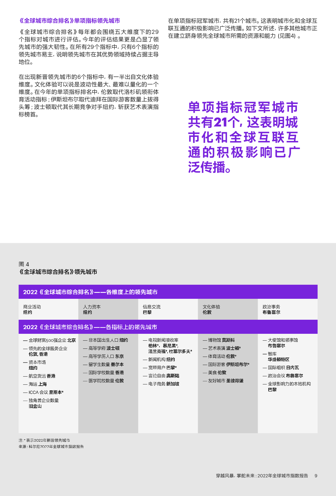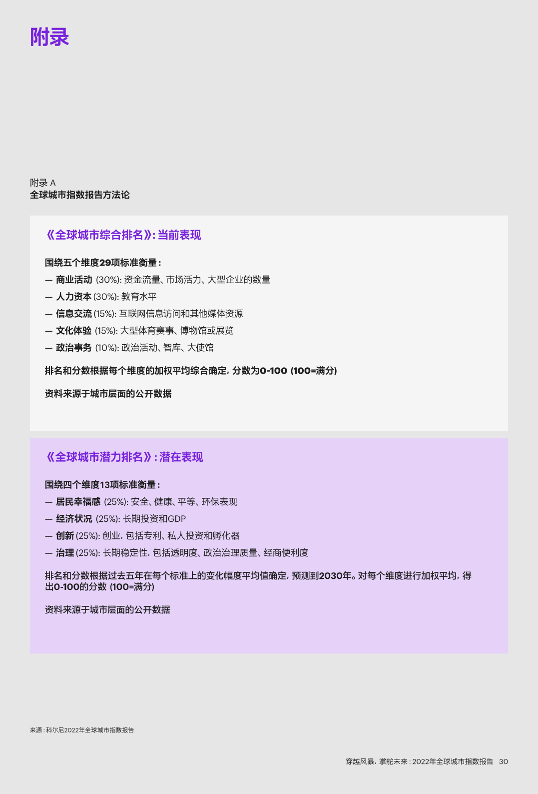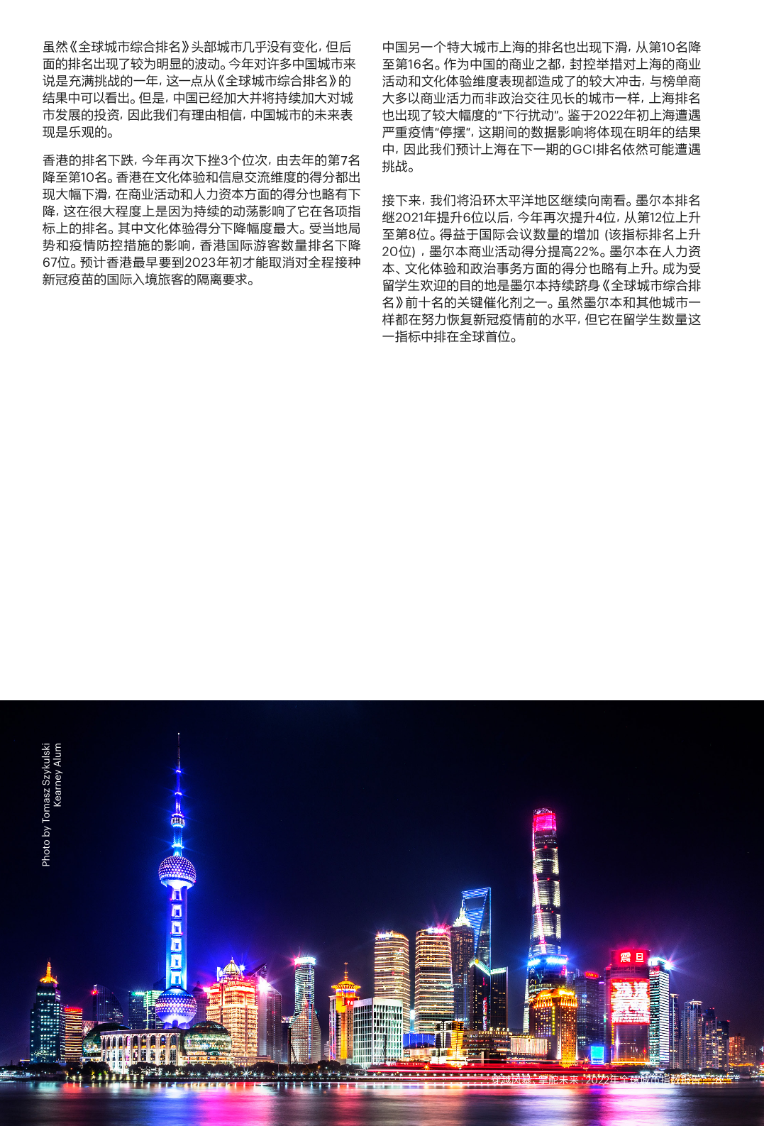 全球城市综合排名旨在量化一个城市吸引、留住和促进全球资本、人才和创意流动的能力。尽管在商业活动和人力资本两个维度上的得分较往年有所下降,纽约和伦敦仍然蝉联榜单冠亚军。巴黎和东京也保持了其原有排名,分别位列第三和第四。北京排名上升一位,重新进入前五。排名六到十位的分别为洛杉矶、芝加哥、墨尔本、新加坡、香港。