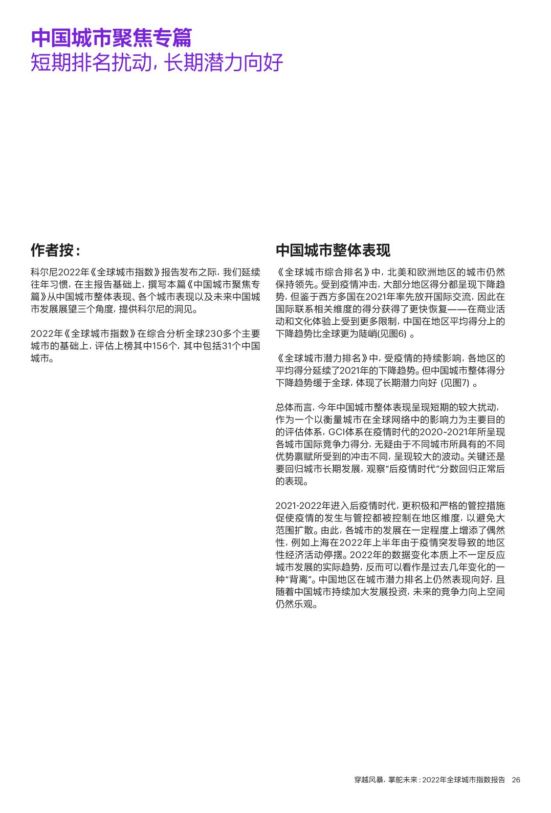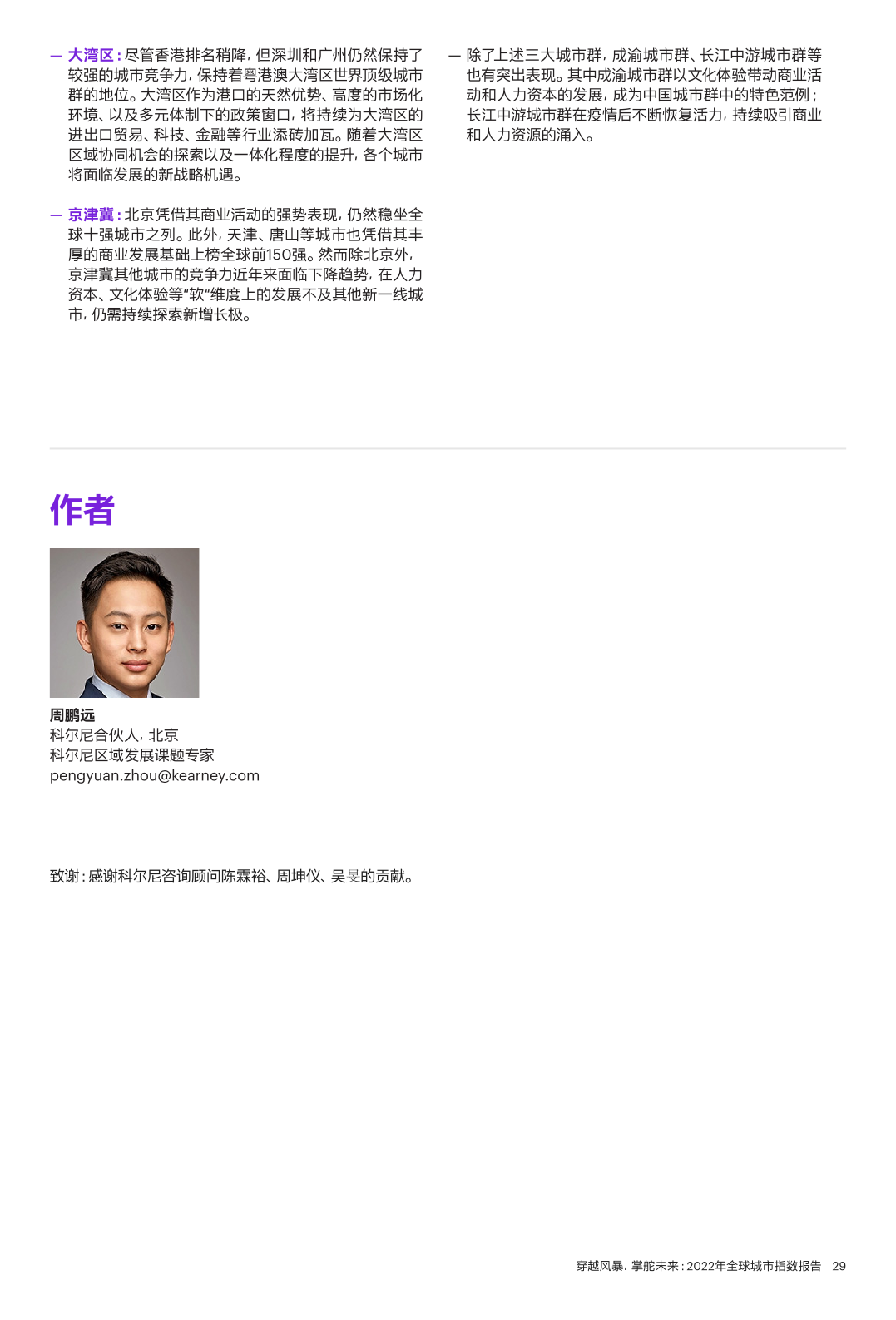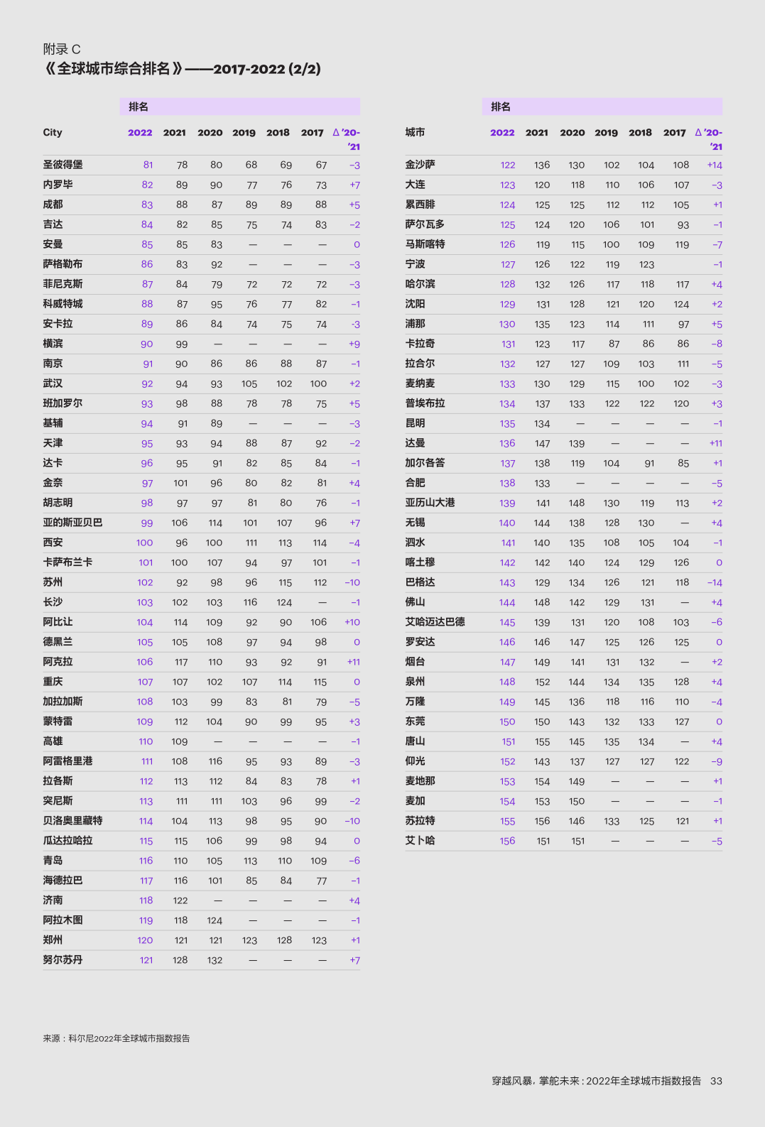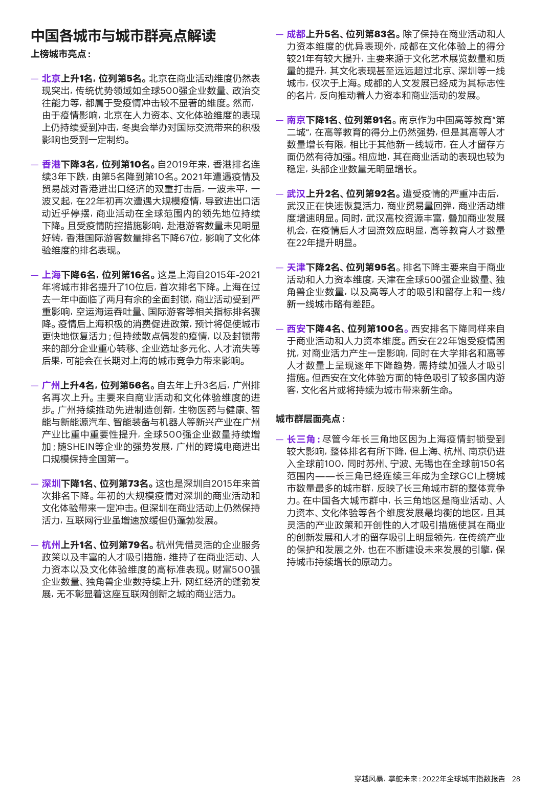 全球城市综合排名旨在量化一个城市吸引、留住和促进全球资本、人才和创意流动的能力。尽管在商业活动和人力资本两个维度上的得分较往年有所下降,纽约和伦敦仍然蝉联榜单冠亚军。巴黎和东京也保持了其原有排名,分别位列第三和第四。北京排名上升一位,重新进入前五。排名六到十位的分别为洛杉矶、芝加哥、墨尔本、新加坡、香港。