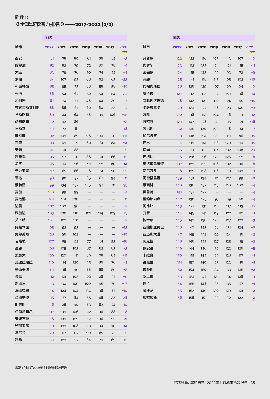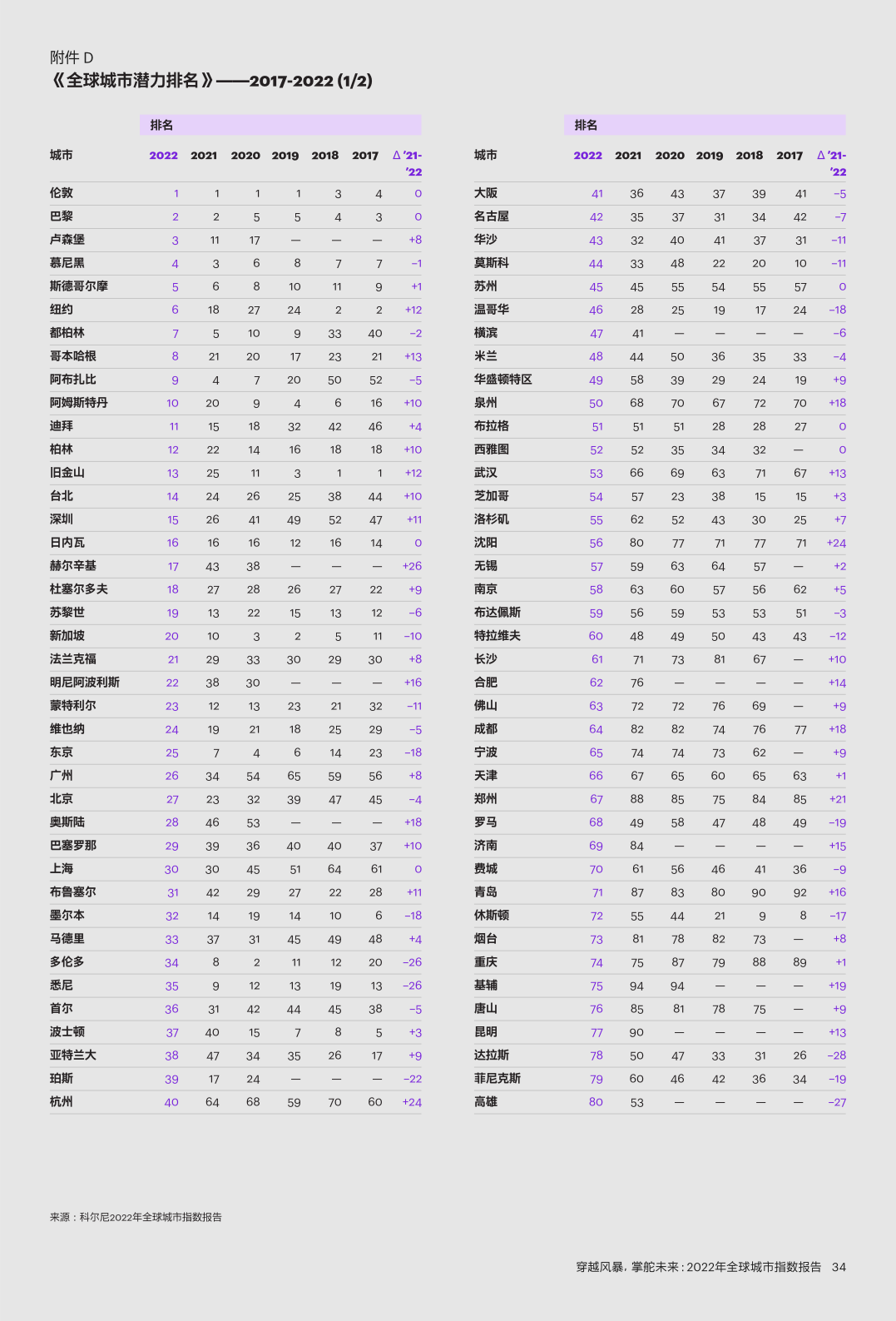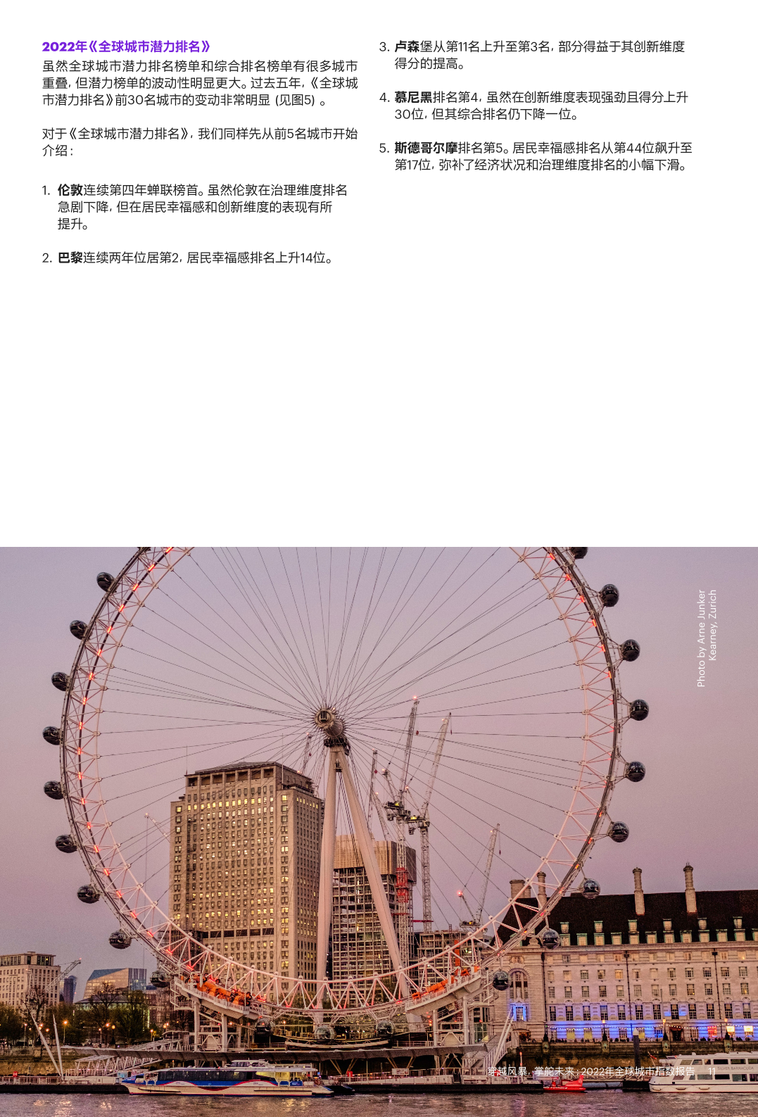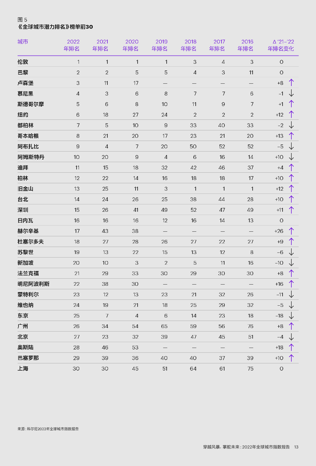 全球城市潜力排名是对全球城市如何保持或增强其未来全球影响力的评估。伦敦连续第四年蝉联榜首,巴黎再度成为亚军。卢森堡从第十一名跻身第三名,慕尼黑下滑1位至第四名,斯德哥尔摩上升1位,排至第五。值得关注的是,在评估的所有城市中,有51个(占样本的近三分之一)在过去一年的排名上升幅度超过六位,这其中有17个城市来自中国。