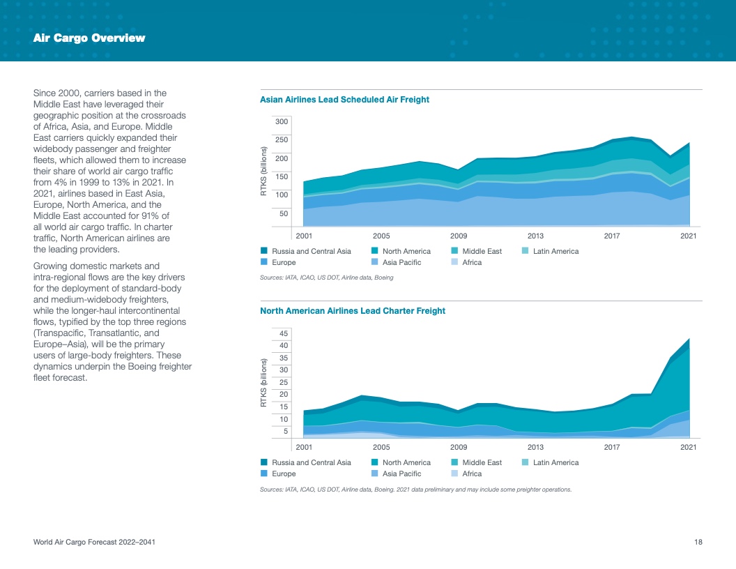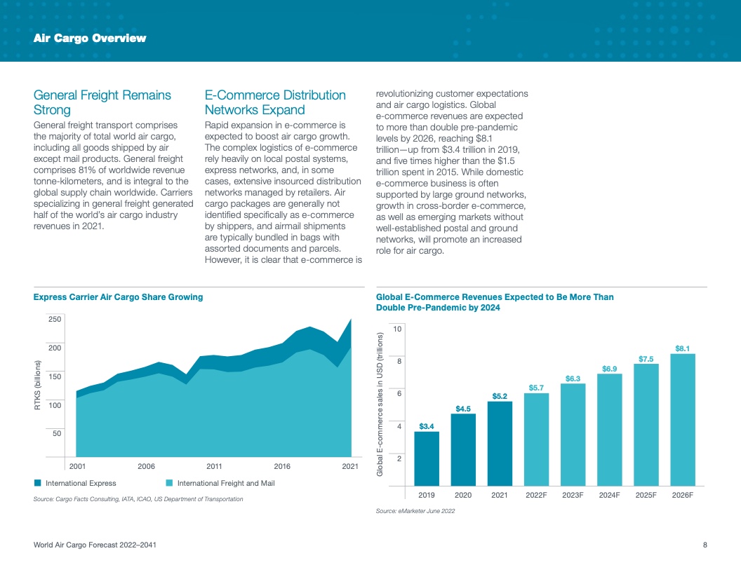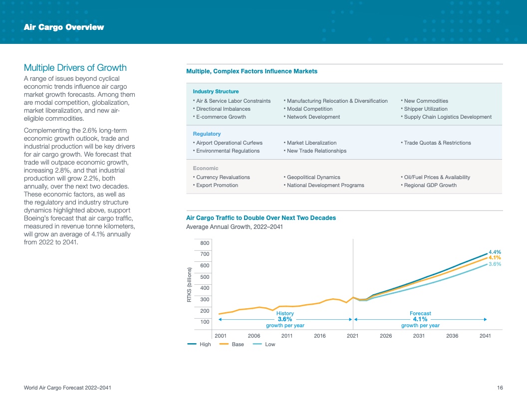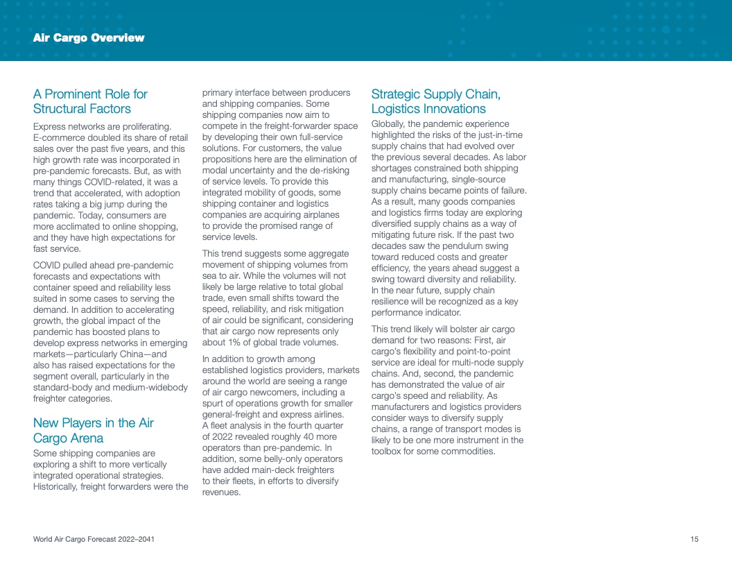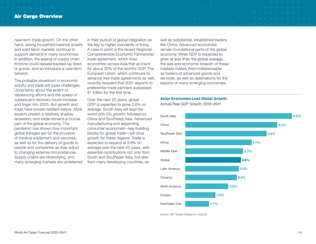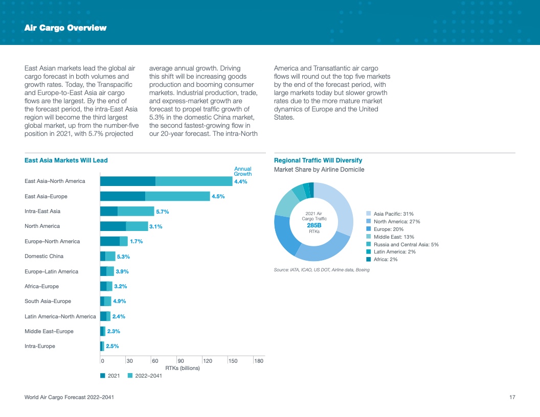 根据该公司最新发布的2022年《世界航空货运预测》(WACF),未来20年航空货运服务需求将保持强劲,全球航空货运量将翻番。