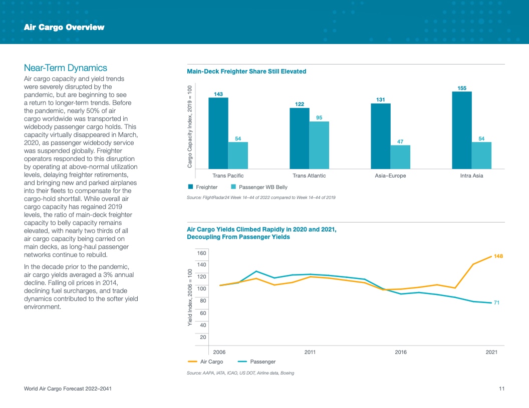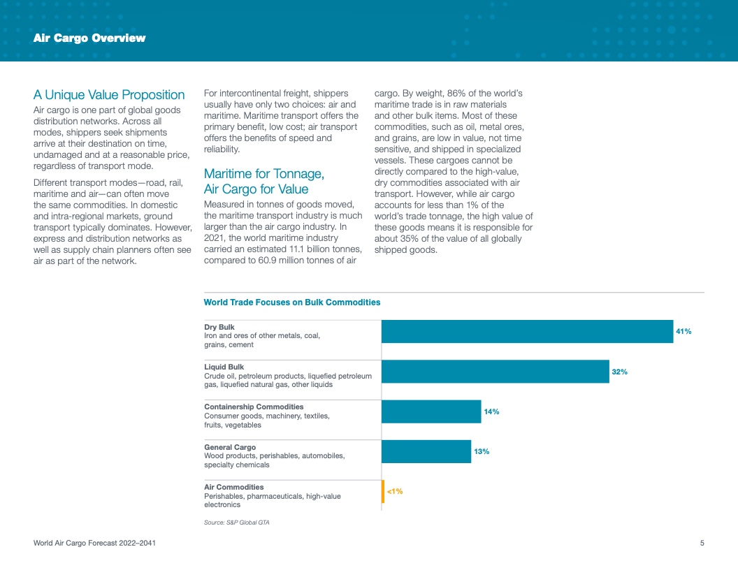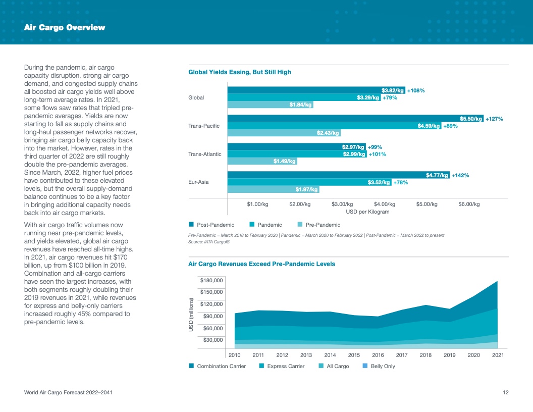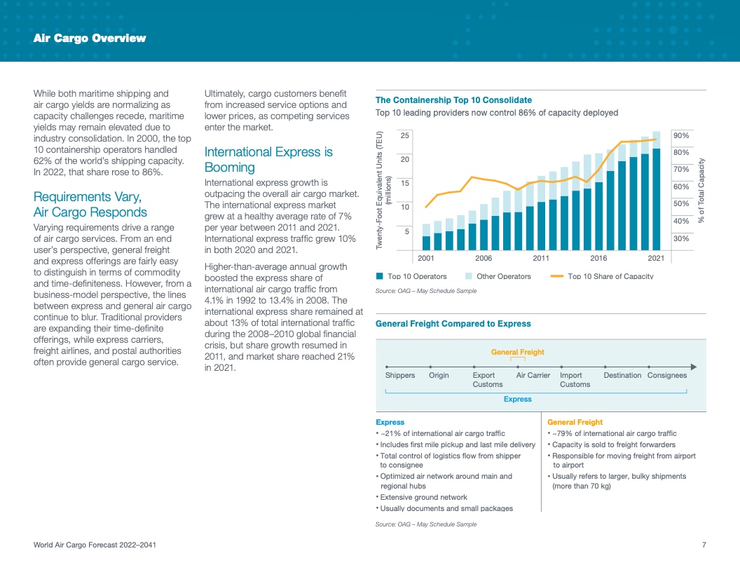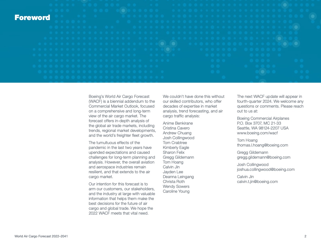 根据该公司最新发布的2022年《世界航空货运预测》(WACF),未来20年航空货运服务需求将保持强劲,全球航空货运量将翻番。