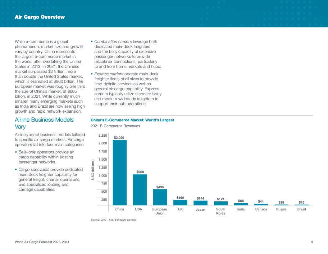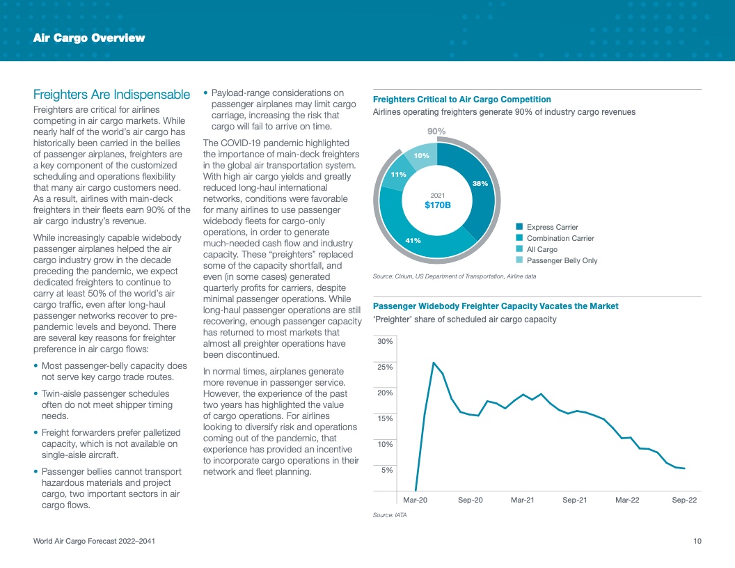 2022年WACF指出,从现在到2041年,全球货运机队需要近2800架原装货机和改装货机来满足行业增长和替换老旧机型的需要。在预测期内,航空货运量将增长一倍以上,承运人需要引进能力更强、燃油效率更高而且更加可持续的飞机(例如777-8货机)来满足市场需求。三分之一的交付量将由新生产的原装货机组成。剩余三分之二将由改装货机组成(例如737-800波音改装货机),它们可以为承运人在现有和新兴市场中提供更强的灵活性。
