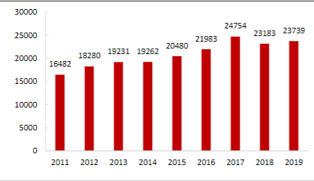 图:2010-2019 年工程勘察设计行业企业数量(单位:个)
