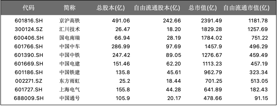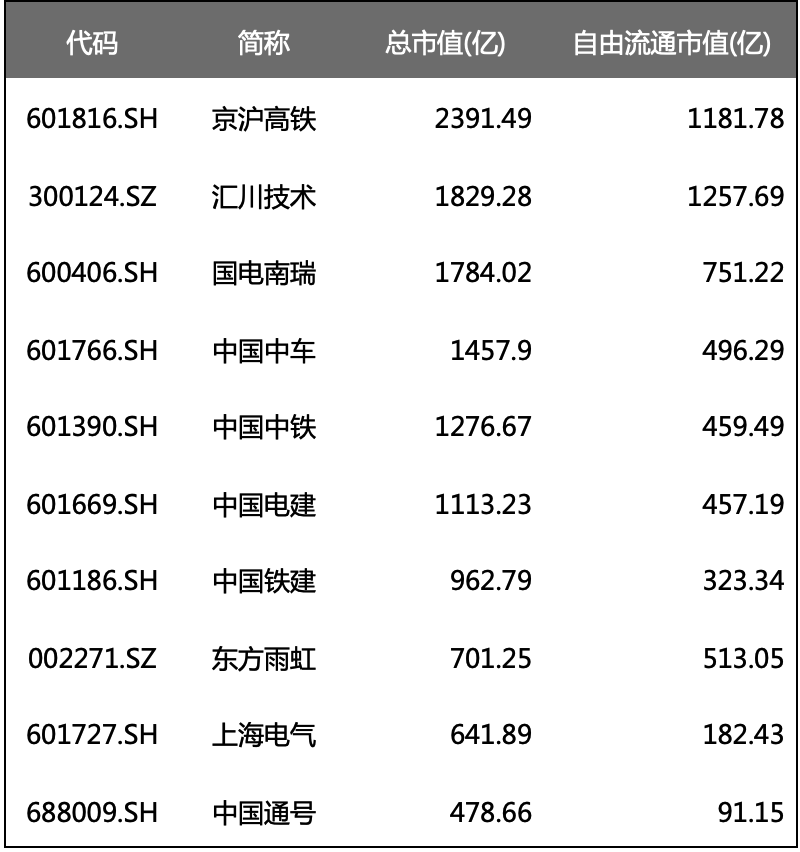 中国主要企业有京沪高铁【601816.SH】、汇川技术【300124.SZ】、国电南瑞【600406.SH】、中国中车【601766.SH】、中国中铁【601390.SH】、中国电建【601669.SH】、中国铁建【601186.SH】、东方雨虹【002271.SZ】、上海电气【601727.SH】、中国通号【688009.SH】等。