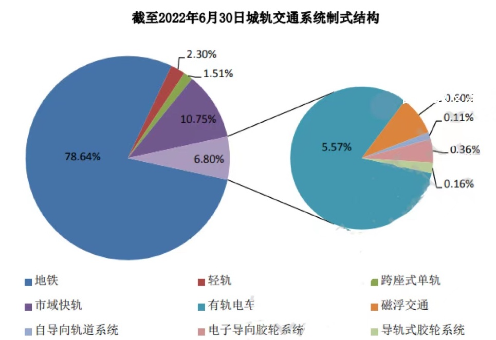 截至 2020 年底,城轨交通运营线路中共有 8 种制式同时在运营。其中,地铁 6280.8 公里,占比 78.81%;轻轨 217.6 公里,占比 2.73%;跨座式单轨 98.5 公里,占比 1.24%;市域快轨 819.6 公里,占比 10.28%;有轨电车 464.6 公里,占比 5.83%;磁浮交通 57.7 公里,占比 0.72%;自导向轨道系统 10.2 公里,占比 0.13%,电子导向胶轮系统 20.7 公里,占比 0.26%。