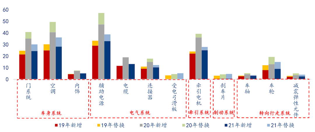 目前上市公司业务所涉及能够进入投资视野的产品包括牵引系统、制动系统(包含刹车片)、门系统、空调、辅助电源以及车轴轮对等。
