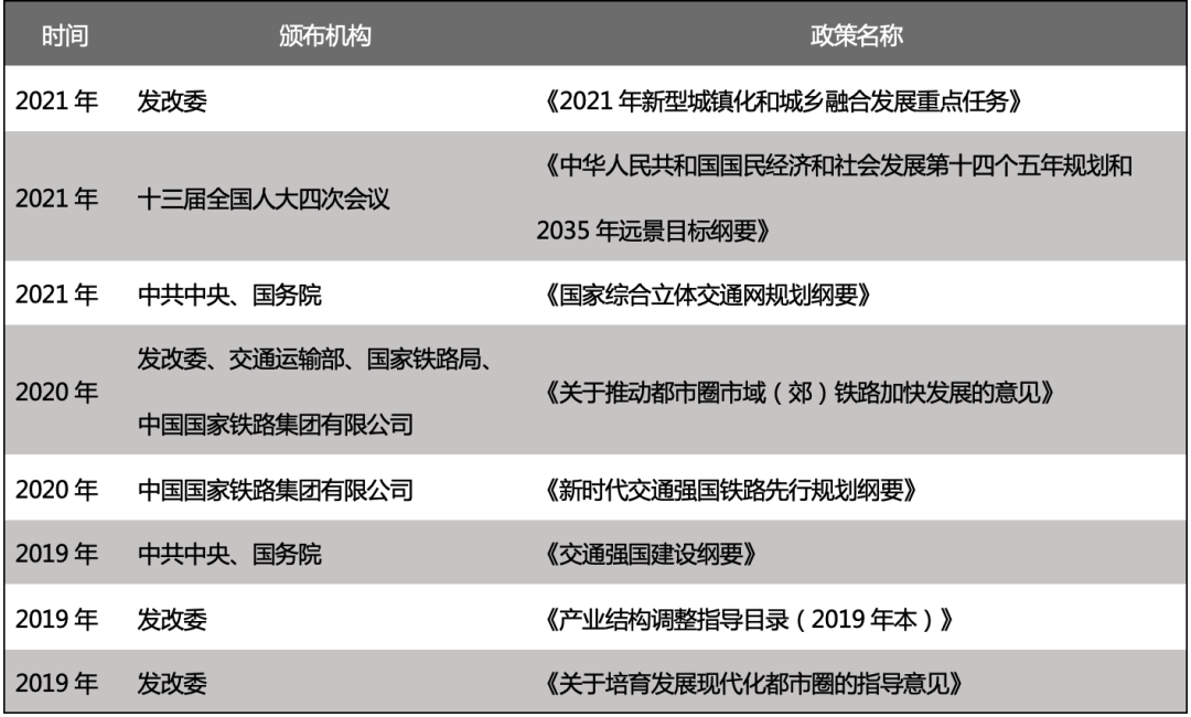 中心城市、都市圈和城市群已经成为经济发展的重要平台。国家政策层面,支持都市圈建设,加快推进都市圈交通基础设施一体化规划建设。在中心城市、都市圈和城市群的基础设施建设中,轨道交通将成为一大重点。