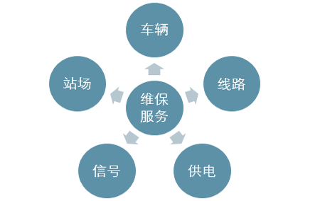 轨道交通的维护服务主要是保障轨道交通安全运行的基础, 对于运营公司属于成本端, 是运营管理的重要组成部分. 线路级别不同, 修程修制各异, 但维保服务大体都可以分为五大系列:车辆系统维保、线路系统维保、供电系统维保、信号系统维保、站场系统维保, 分别负责对轨道交通各子系统的检测、检修、维护保养。