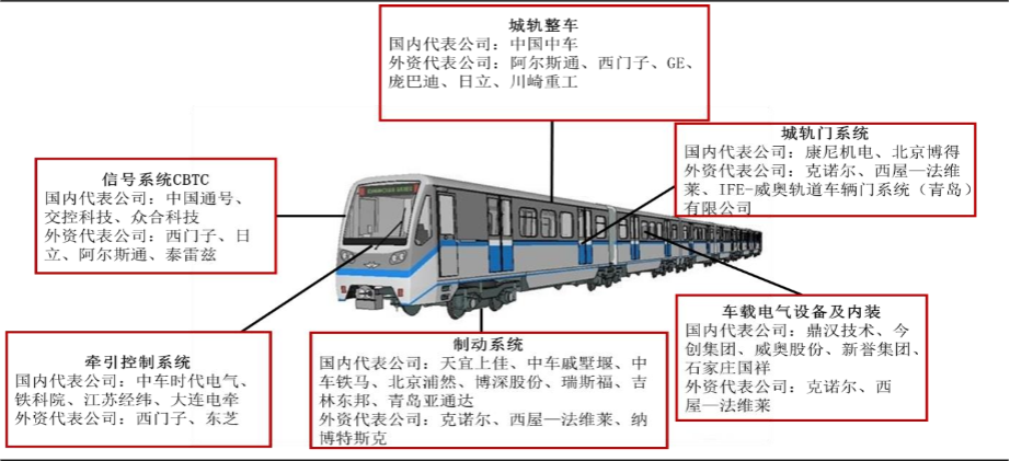 图:城市轨道交通车辆主要结构部件及国内外代表公司