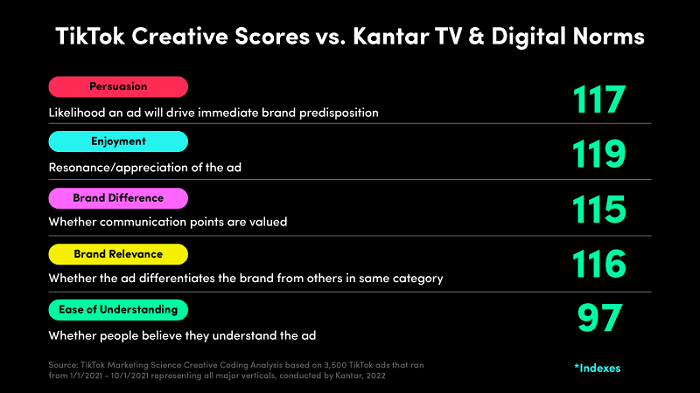 TikTok与Kantar合作,对TikTok广告与电视广告在推动品牌以及产品知名度方面进行了分析。根据Kantar Link AI的分析,超过3500个产品的TikTok广告在多个指标上优于其在其他数字平台的广告以及电视广告的表现,指标包括前期转化(即观众在观看广告后主动进一步了解品牌或产品)、观众的认同感、满意度。