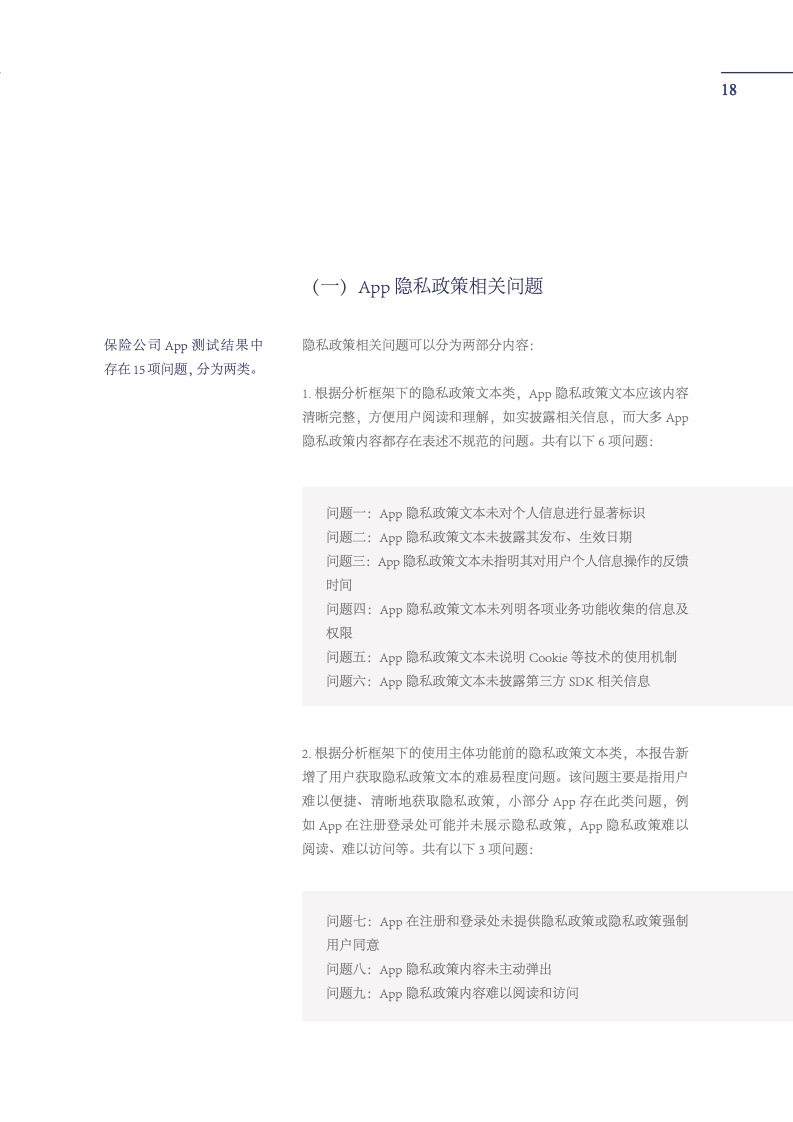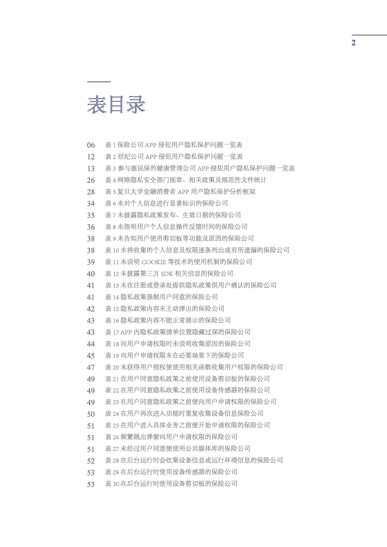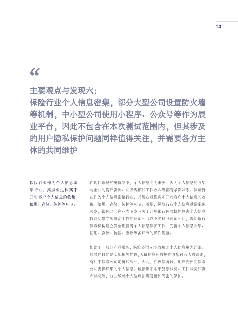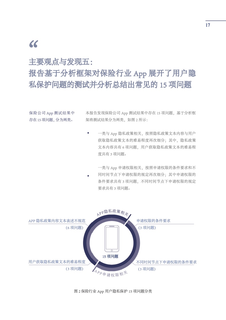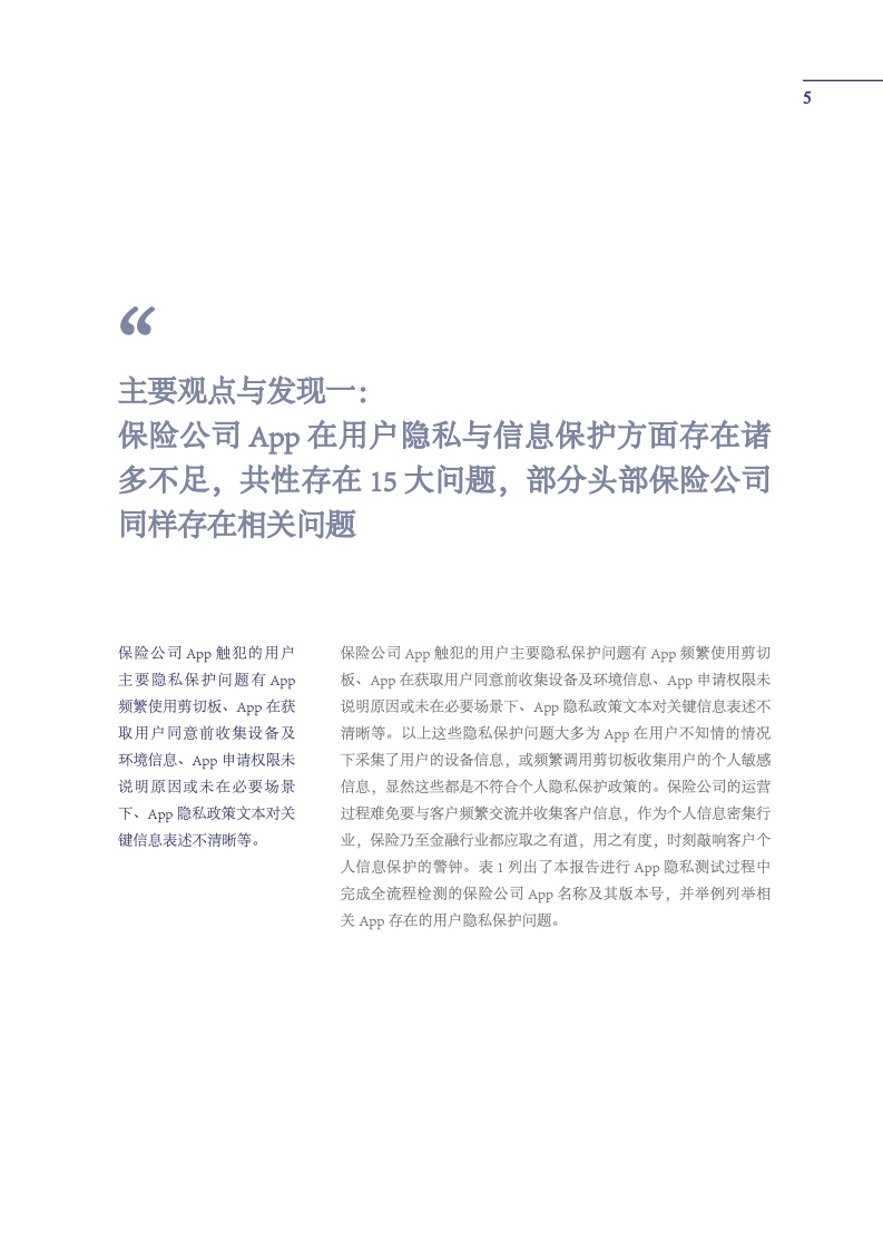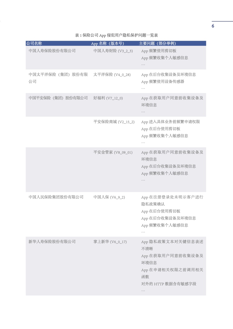 报告从积极引导金融行业重视消费者个人隐私保护,规范个人信息保护的角度出发,选取52家中国保险行业协会所发布保险公司主要使用的App、保险中介和部分参与惠民保业务健康管理公司的App作为测试样本,采用复旦大学金融消费者App用户隐私保护分析框架,检视我国当前保险App对用户隐私与消费者个人信息保护的现状与问题,包括未经允许私自进行用户数据收集、频繁访问收集用户剪切板信息等问题,并总结提炼了6大发现。