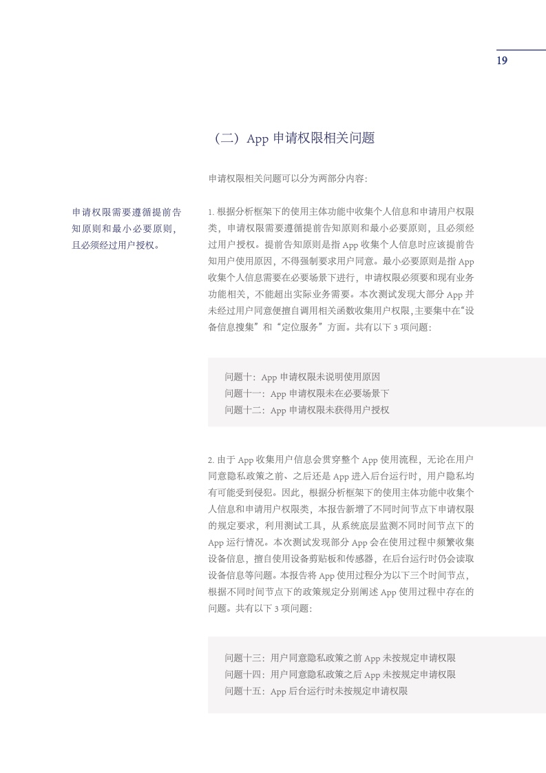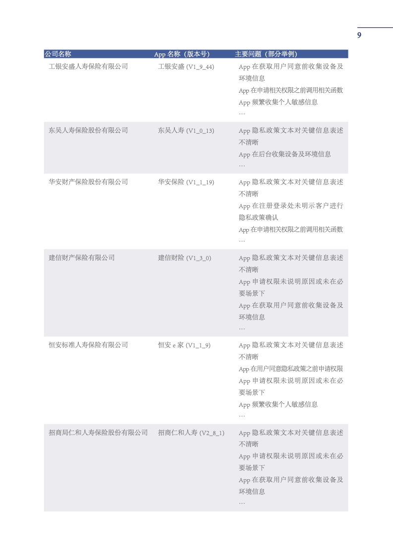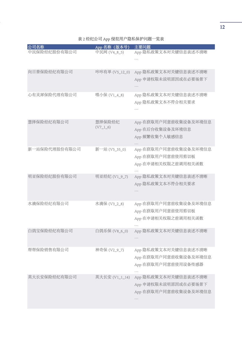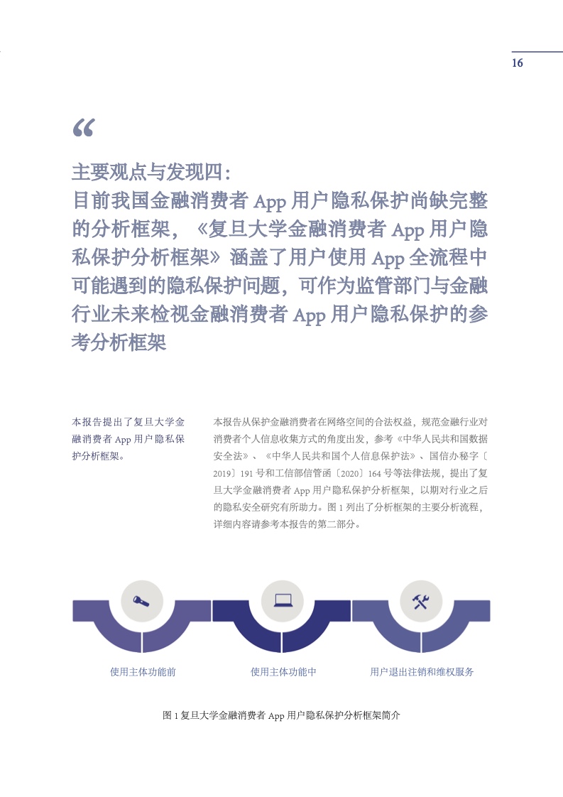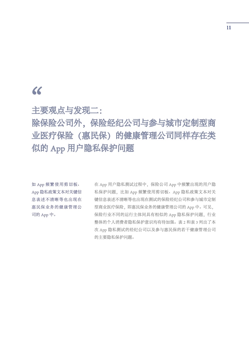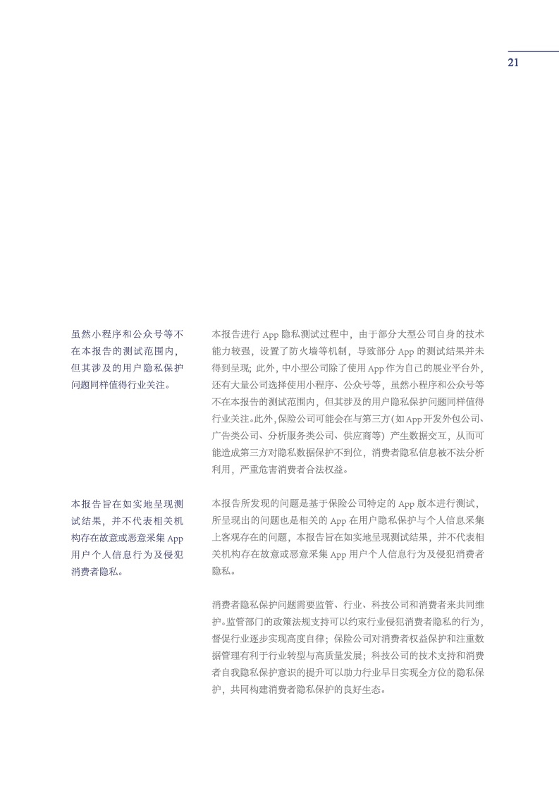 报告从积极引导金融行业重视消费者个人隐私保护,规范个人信息保护的角度出发,选取52家中国保险行业协会所发布保险公司主要使用的App、保险中介和部分参与惠民保业务健康管理公司的App作为测试样本,采用复旦大学金融消费者App用户隐私保护分析框架,检视我国当前保险App对用户隐私与消费者个人信息保护的现状与问题,包括未经允许私自进行用户数据收集、频繁访问收集用户剪切板信息等问题,并总结提炼了6大发现。