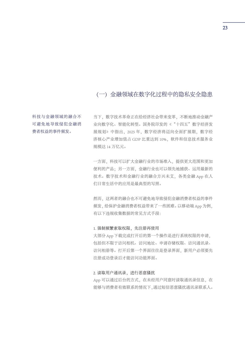 随着数字化进程的加快,金融领域的个人隐私与个人信息安全隐患逐渐暴露。一方面,科技可以扩大金融行业的市场准入,提供更大范围和更加便利的产品;另一方面,金融行业也可以领先地捕获、运用最新的技术。这两者的融合也不可避免地导致侵犯金融消费者权益的事件频发,给保护金融消费者权益带来了一些困难。