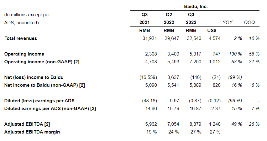 百度发布了截至 9 月 30 日的 2022 年第三季度财报。财报显示,百度第三季度总营收为 325 亿元(约合 45.7 亿美元),与上年同期相比增长 2%。归属于百度的净亏损为 1.46 亿元(约合 2100 万美元),每股美国存托股(ADS)摊薄亏损 0.87 元(约合 0.12 美元);不按美国通用会计准则(Non-GAAP),归属于百度的净利润为 59 亿元(约合 8.28 亿美元),同比增长 16%,每股美国存托股(ADS)摊薄收益 16.87 元(约合 2.37 美元)。