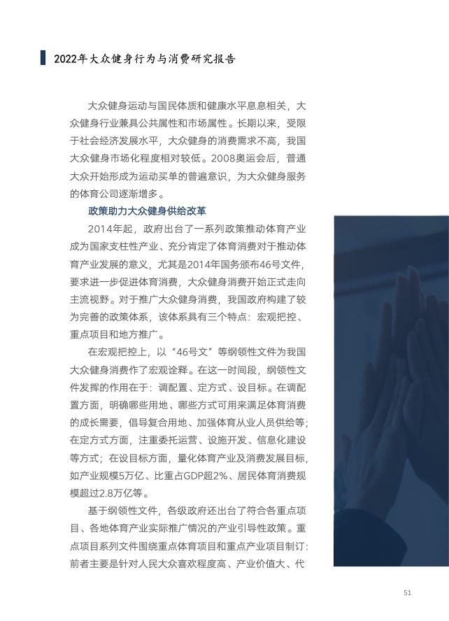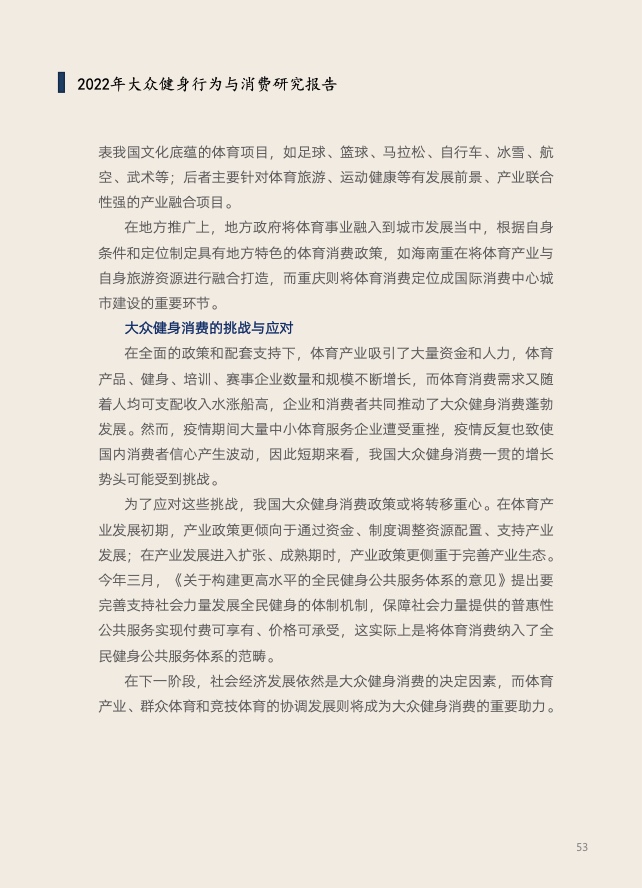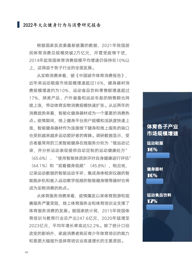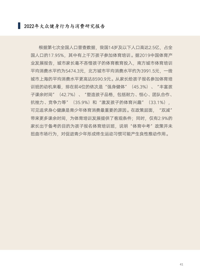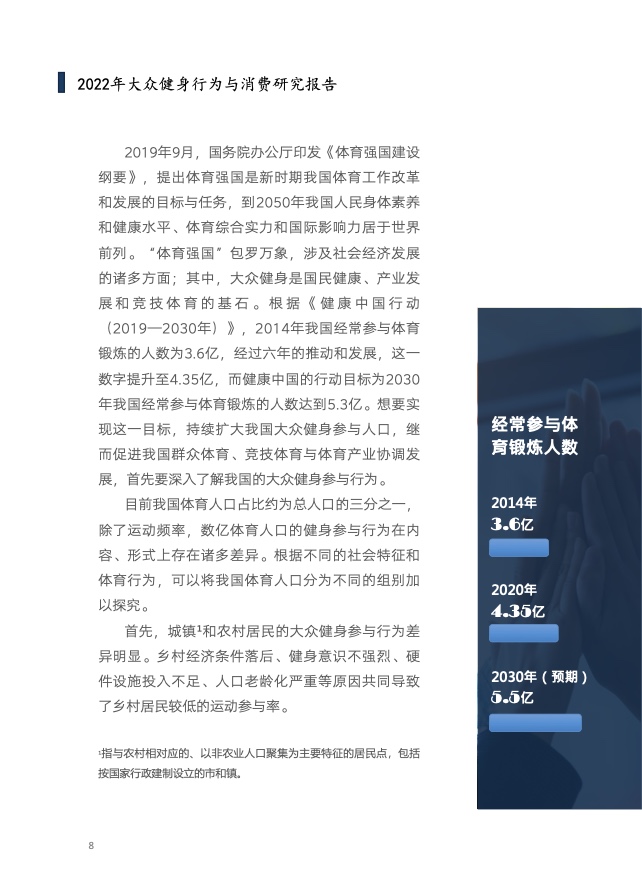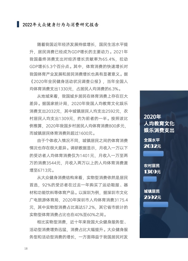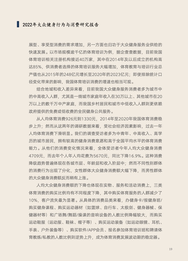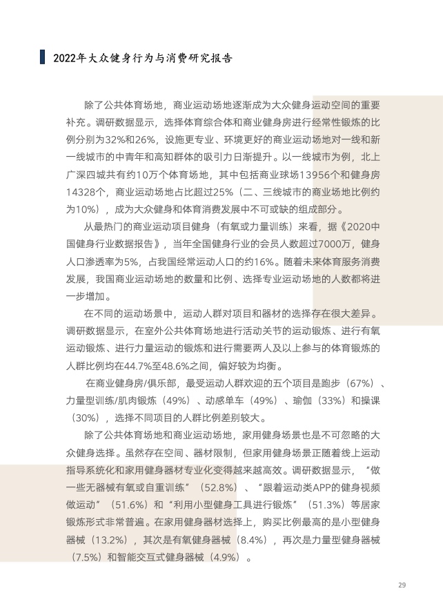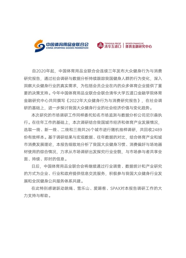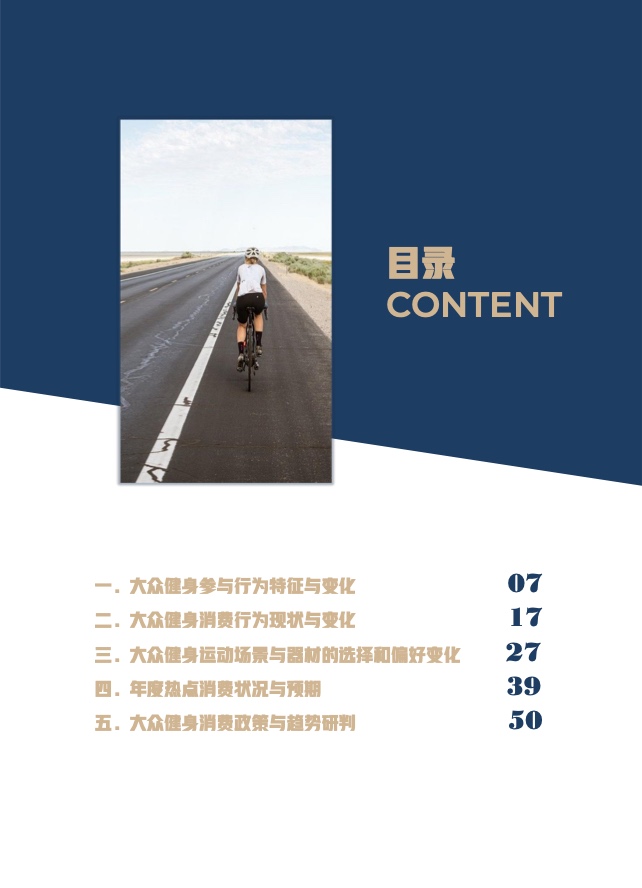 《报告》共分为五个章节,分别从参与、消费、场景与器材、消费热点以及政策和趋势的维度,对大众运动的行为与消费展开了一系列的研究。除特别注明外,本报告中的“大众健身”均特指城市居民体育活动。